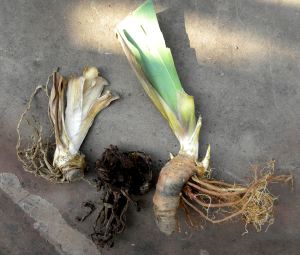 As I wrote in my last post, one out of the nine bearded iris rhizomes that I just purchased at Lowes Home Improvement nursery center was dead. Departed. Deceased. Rotten to its mushy core. I give you Exhibit A in the photo above. Compare the brown, rotted rhizome in the center to the robust, healthy rhizome on the right from Greenwood Garden in Somis, CA, or even the dessicated but alive Lowes rhizome on the left. The difference is clear.