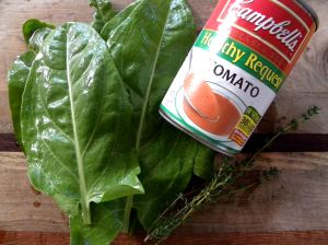 I have one clump of sorrel in my herb garden, and it grows just about as fast as we want to eat it. I decided to make a nice tomato-sorrel bisque today. Sometimes I make my tomato bisque from scratch. Alas, I had no ripe tomatoes in my late November garden, so I resorted to canned soup.