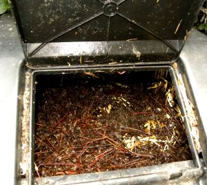 I put the dirty bedding into the composter, covered with damp, chipped leaves, and watered it all. The composter is nearly full now, but with decomposition, the level will drop almost foot in a week or two. When I take compost out of the bottom, the level drops by about two feet.