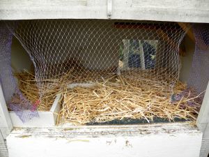This close-up of the coop interior shows the three nest boxes on the left (but they only use one of them, the one in the far left back corner), as well as the roosting poles, which are nearly out of sight in the upper right. Poop falls onto the straw on the right side, leaving the nest boxes clean. Tiles on the bottom of the coop floor make clean-up easier.