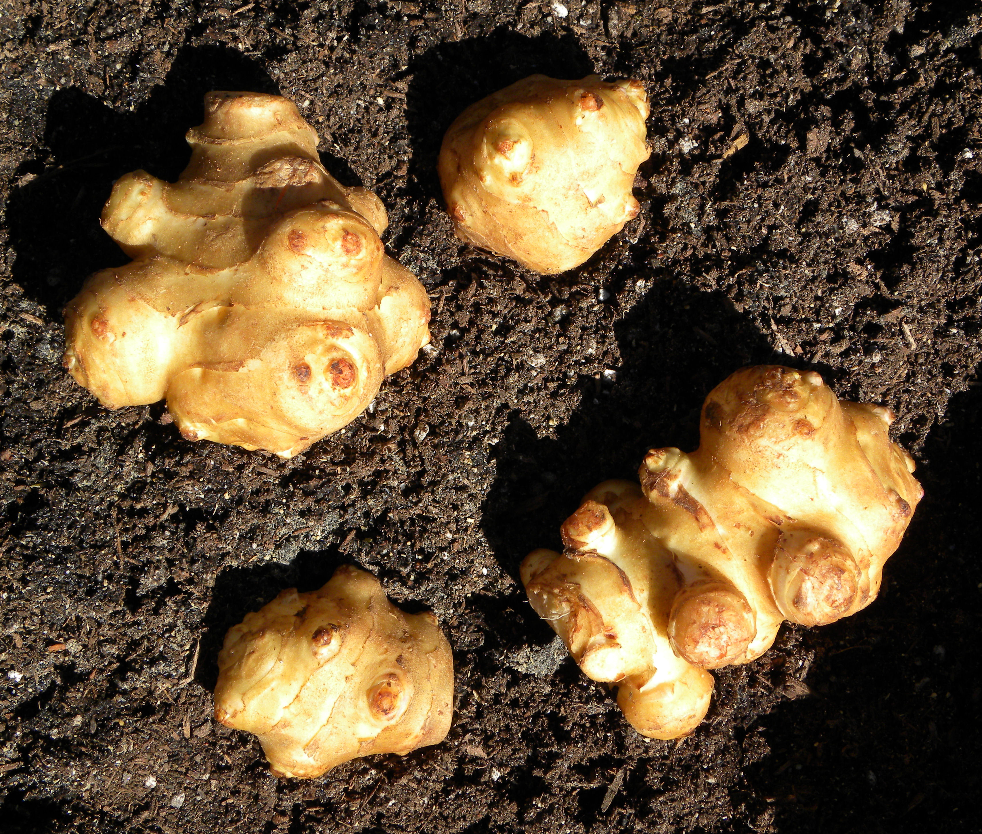 In most areas, harvesting is in August or later, or about 4-5 months after planting. I expect to harvest them in July here. The tubers should be eaten as soon as they’re dug up because they dry out quickly, so most people dig them as they want to eat them. I’ve heard that there is no need to replant if you grow them in the ground because you never find them all.