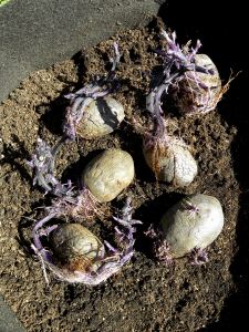 I filled three Smart Pots with potting soil to within about three inches of the top, then mixed in some E.B. Stone Sure Start organic fertilizer that is inoculated with mycorrhizae and other good microbes. I used one pot for sunchokes and two for some blue potatoes that had sprouted in my potato bin. Those pots are going to sit in the driveway where they’ll get sun all day long.