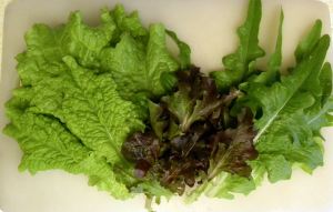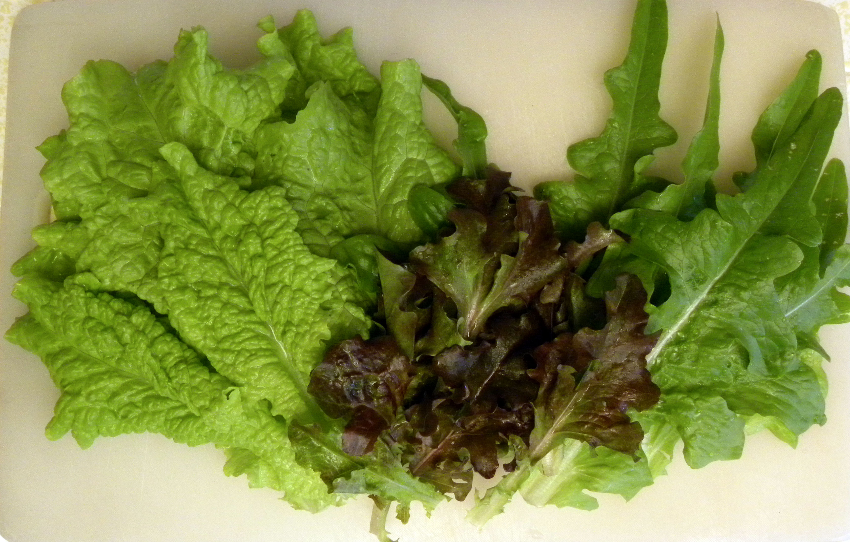 The three types of lettuce ready now for harvest in my garden are (l. to r.) Black-seeded Simpson, Red Salad Bowl, and Green Oakleaf.