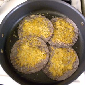 Huevos rancheros are really easy to make. Heat some corn tortillas in a pan, two per person. I used blue corn tortillas. Flip them over. Put some grated cheese on top of the tortillas and leave them in the pan just long enough to melt the cheese. Put the tortillas on plates. Fry two eggs per person and put them on top of the tortillas. Put some salsa on top of the eggs, and cilantro if you have it. Serve with heated, buttered, and rolled up flour tortillas. Add an orange to the plate if a possum didn’t eat them all.