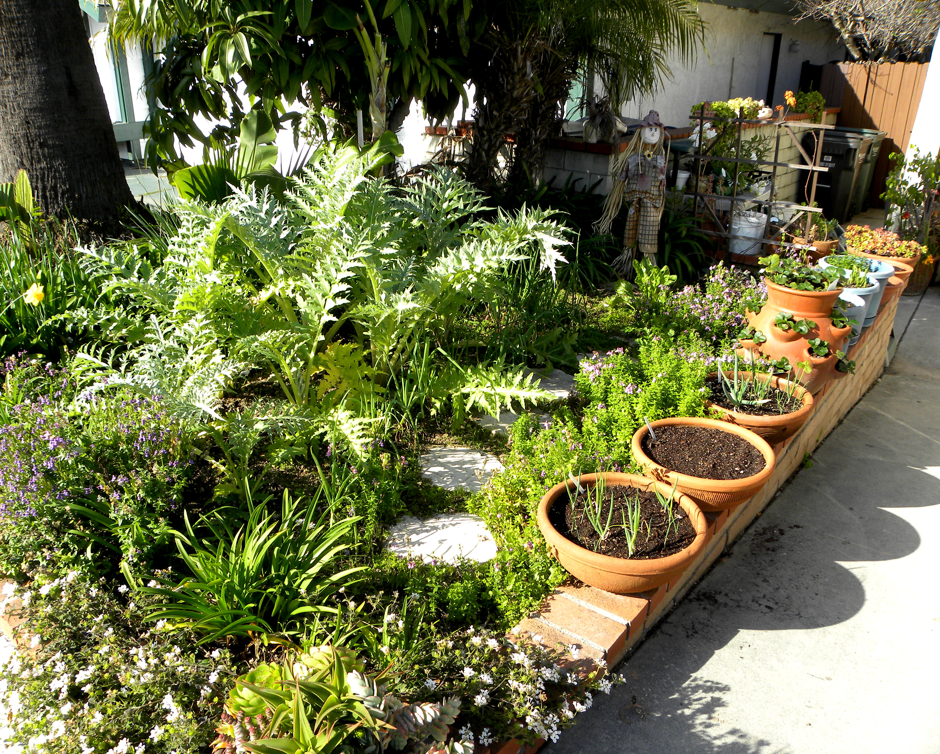 The artichoke tree has loads of buds on it this years, so I’m hoping that some of them set fruit. The avocado tree that I planted is a semi-dwarf, and has been a very poor producer. This year it got more water than usual because the rain barrel overflow spout from our new gutter is directed at the roots of the avocado tree. I am hopeful.