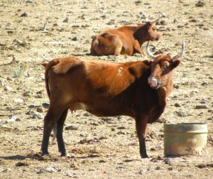 Corriente cattle are a Mexican breed that is adapted to dry desert life. Unlike other cattle breeds that eat grass and hay exclusively, they can eat browse (tips of bushes) like a deer.