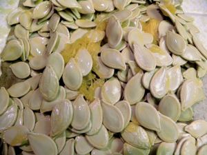 Some people like to eat pumpkin seeds, but I’m not among them. That is, unless someone else has taken off the hulls. I don’t like chewing all of that fibrous seed husk. But if you want to make your own pumpkin seeds, toss them with oil, salt them and bake. Not sure how long or at what temperature, but probably 300 degrees F for 15 minutes.