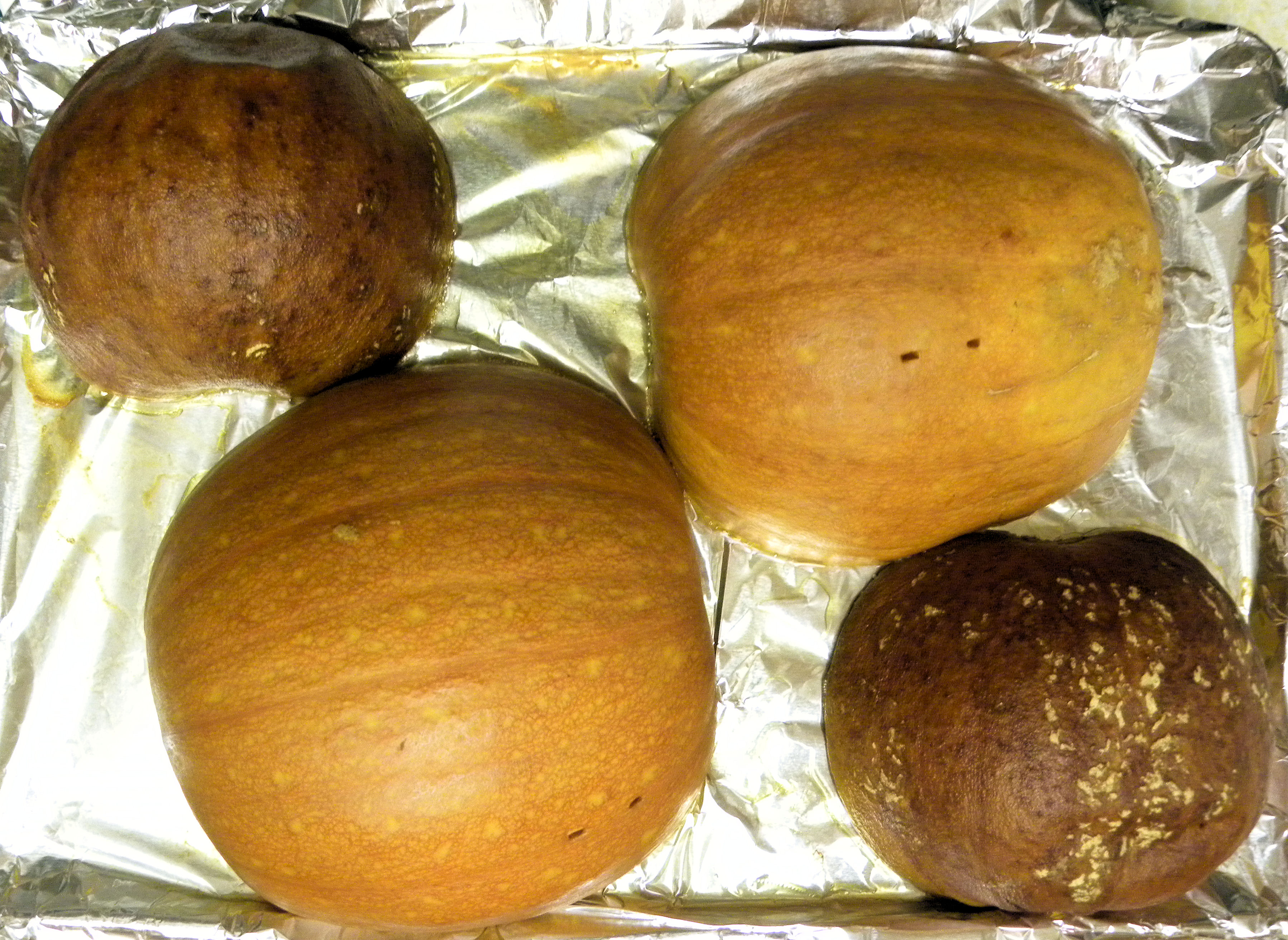 The pumpkins are done when a fork slips through the skin and flesh easily. Note that two of the halves above have fork piercings in them. Let the pumpkins cool enough to be able to handle them comfortably.