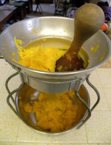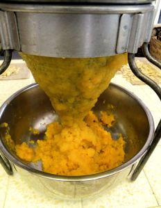 Rotate the pestle, pushing the flesh through the small openings. The long fibers will stay behind in the colander. You can also use a potato ricer for this job. You could use a food processor instead of the colander, but I don’t like the texture of the resulting product as much. It comes out with a texture more like baby food, and yet can still have long strings in it if you use a food processor.