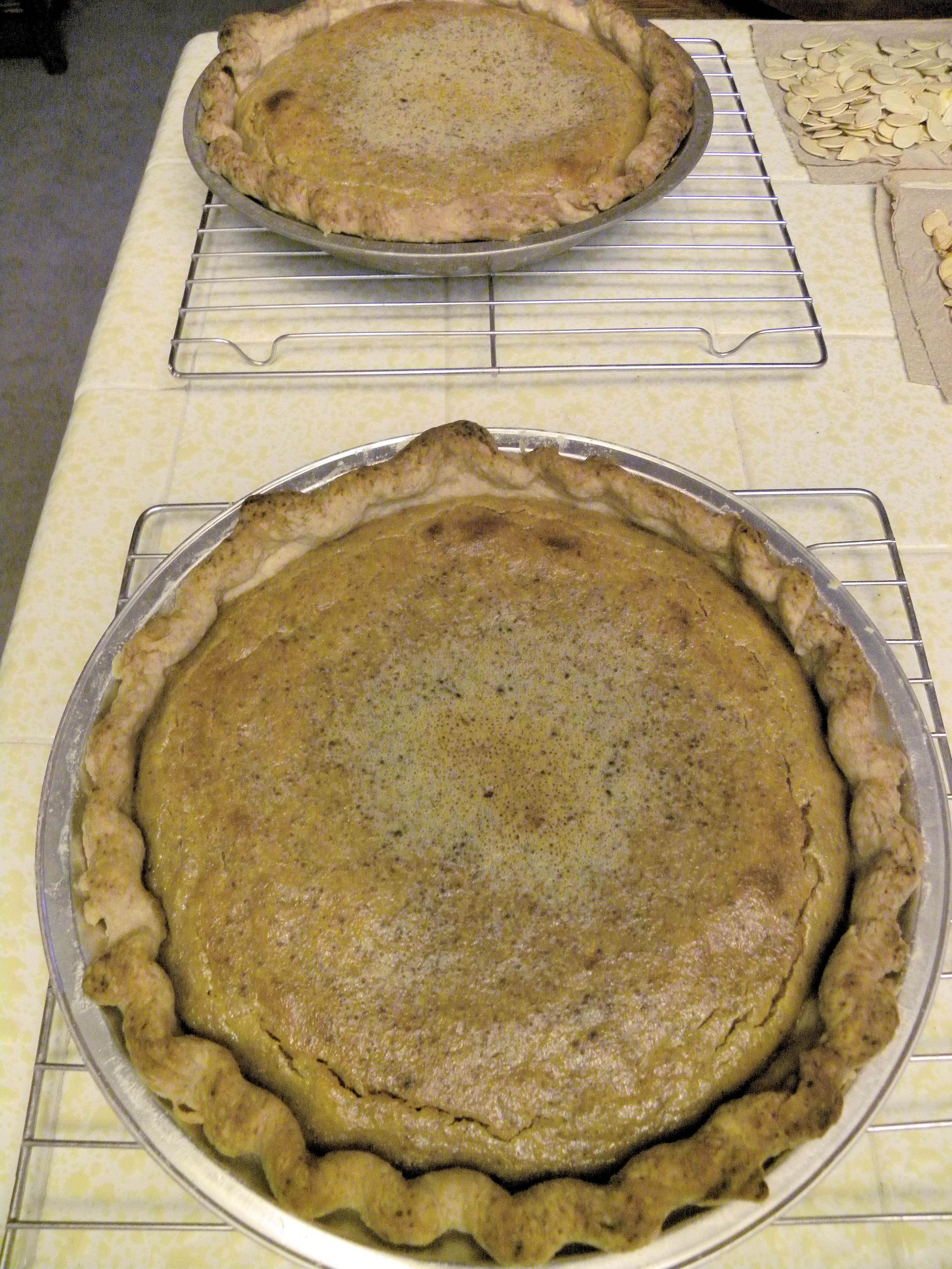 I grew three Amish pie pumpkins this year. They are supposed to get up to 90 lbs each, but mine were small, like New England pie pumpkins. One of them rotted before I could process it, leaving me with two small pumpkins. I’ll get four pies out of them.