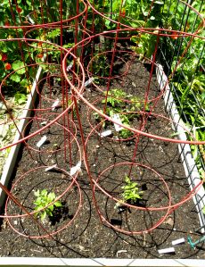 I transplanted most of the tomatoes before last week’s rain. I planted the others after. I now have 16 tomato plants in raised beds, a few volunteers that sprouted from my compost pile that I overwintered, and three more sprouting roots in glasses of water on my windowsill.
