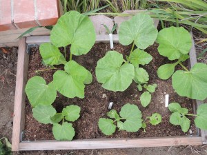 My pumpkin patch. I planted one each Rouge Vif d’Tampes and Queensland Blue for each of my three little granddaughters who live in San Diego. My two big granddaughters are in college in the Seattle area, so I can’t grow Halloween pumpkins for them.