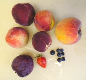 I’m not going to have any photos to show on harvest Monday. Here is one day’s fruit harvest, with the last August Pride peach and some of the Babcock peaches, the first Santa Rosa plum at the bottom, one strawberry and 7 blueberries. Don’t laugh.