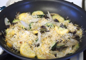 I made lunch with the blue potatoes, a yellow squash, the zucchini, an onion, and some garlic. Sauteed them in bacon grease until done, then added some grated Mexican cheese at the end and let it melt. Still not done, see next photo.