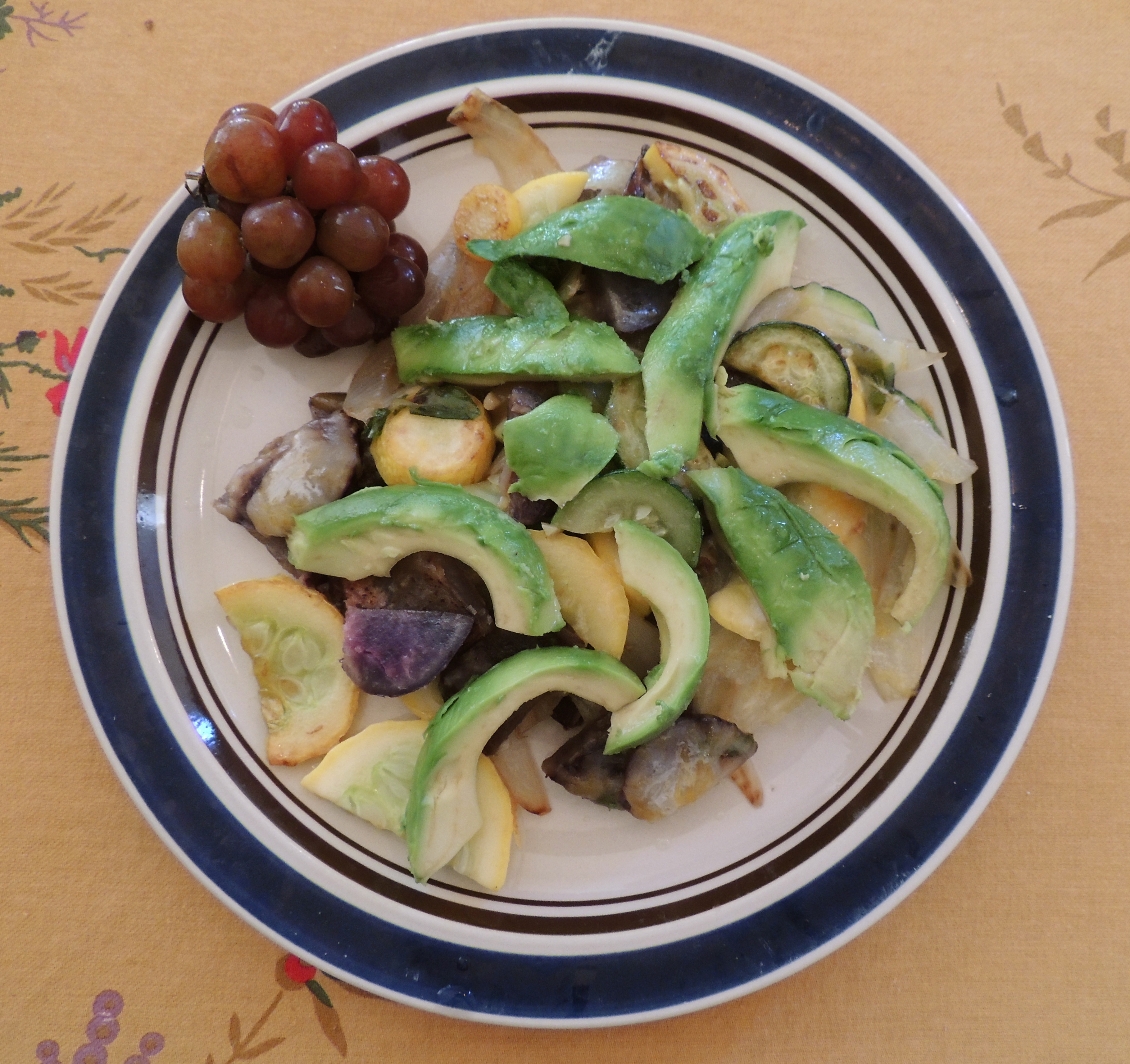 I sliced a ripe avocado onto each plate and squeezed lemon juice on top. It was a strange dish, but filling and delicious. The avocado and lemon were both from my garden.