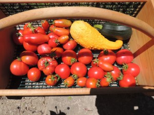 One day’s harvest of tomatoes, and yet another yellow squash.