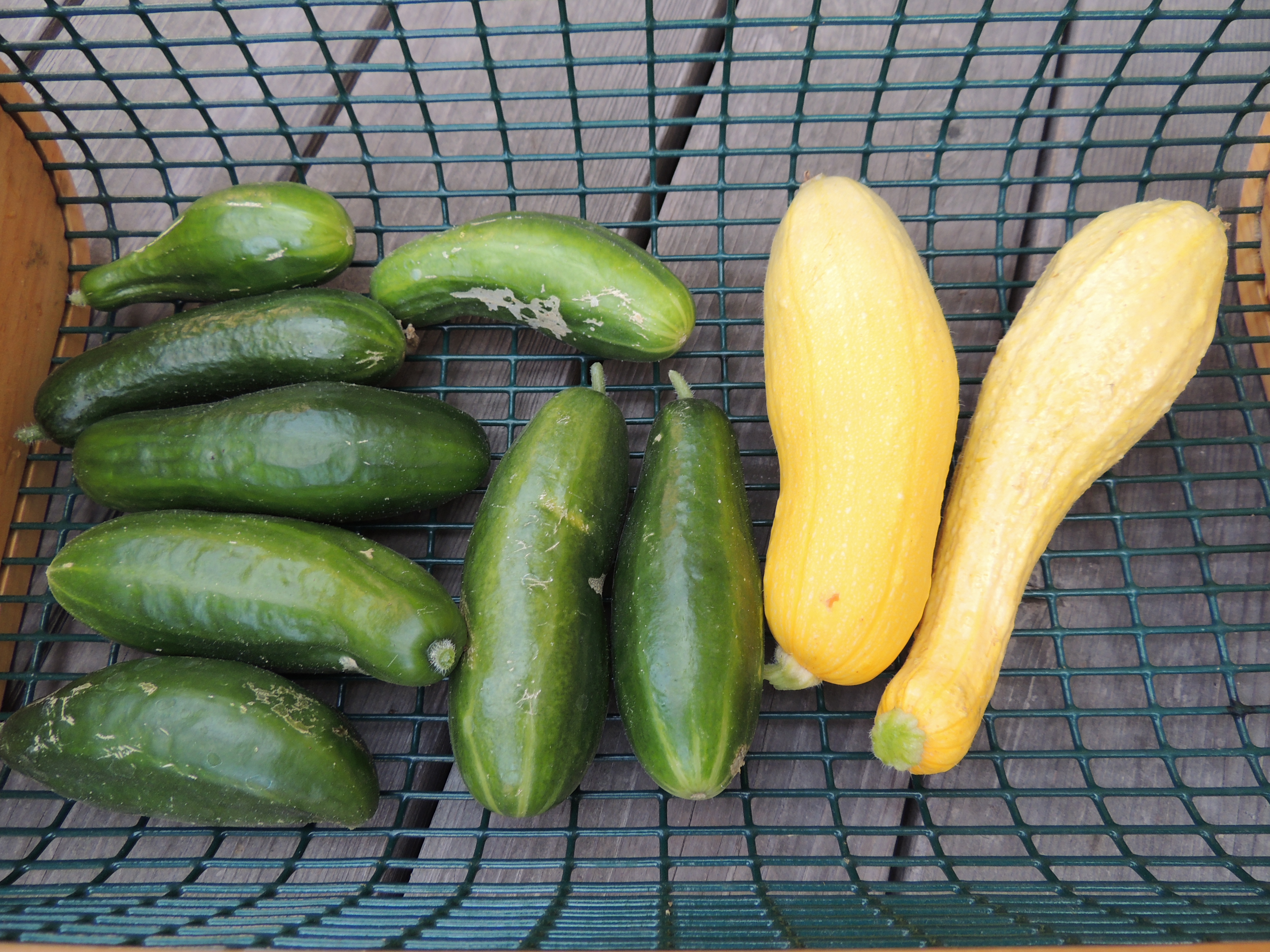One day’s harvest of cucumbers, and yet more yellow squash.