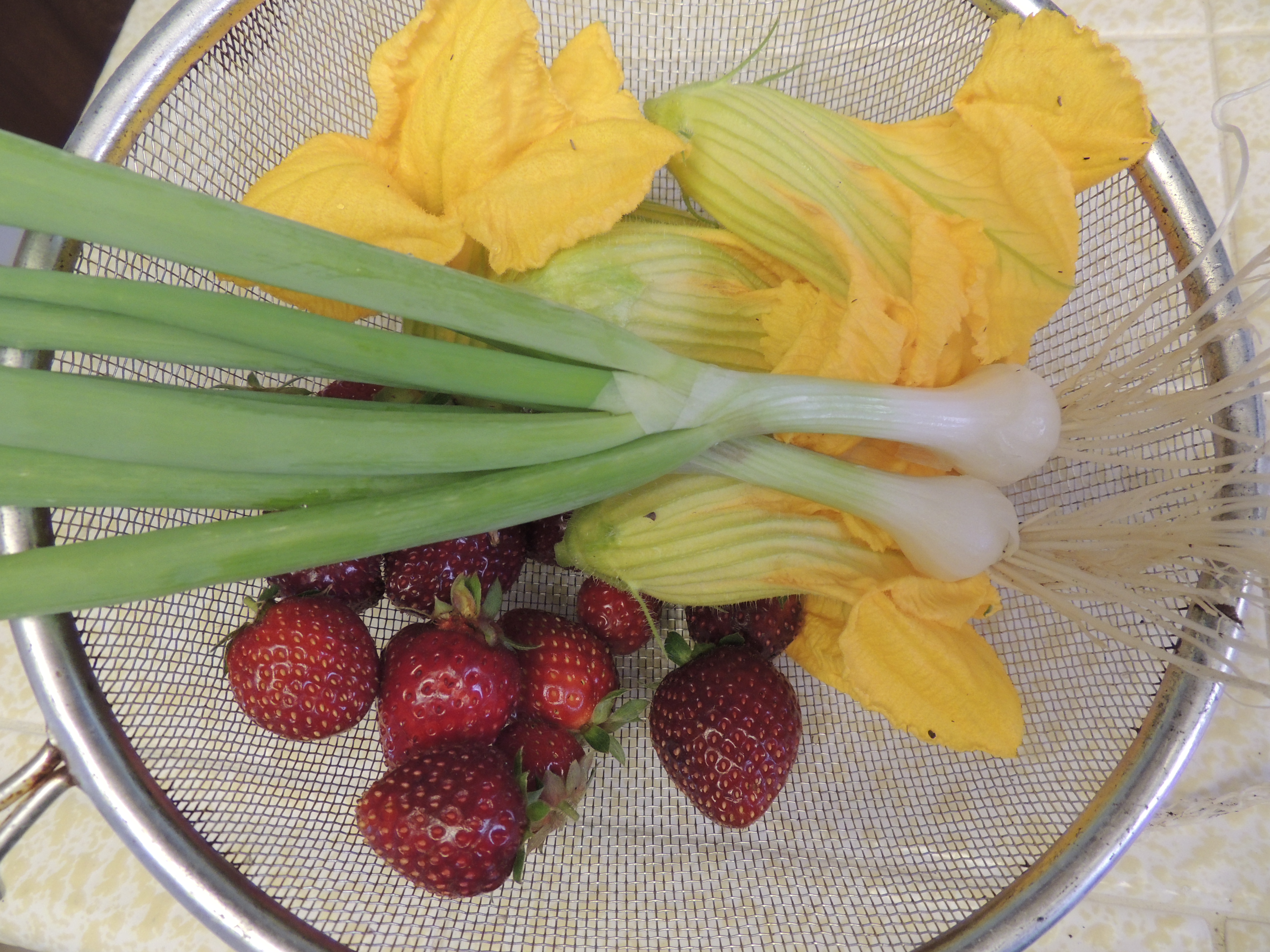 Add four eggs from our hens, and this made a nice breakfast for us. Squash blossom scramble with green onions, with strawberries from the garden on the side.