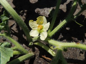 Male flower on my watermelon vine. So far, I haven’t seen any female flowers on the watermelons, but a Hale cantaloupe appears to have set fruit.