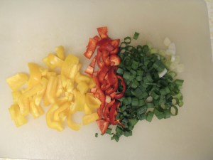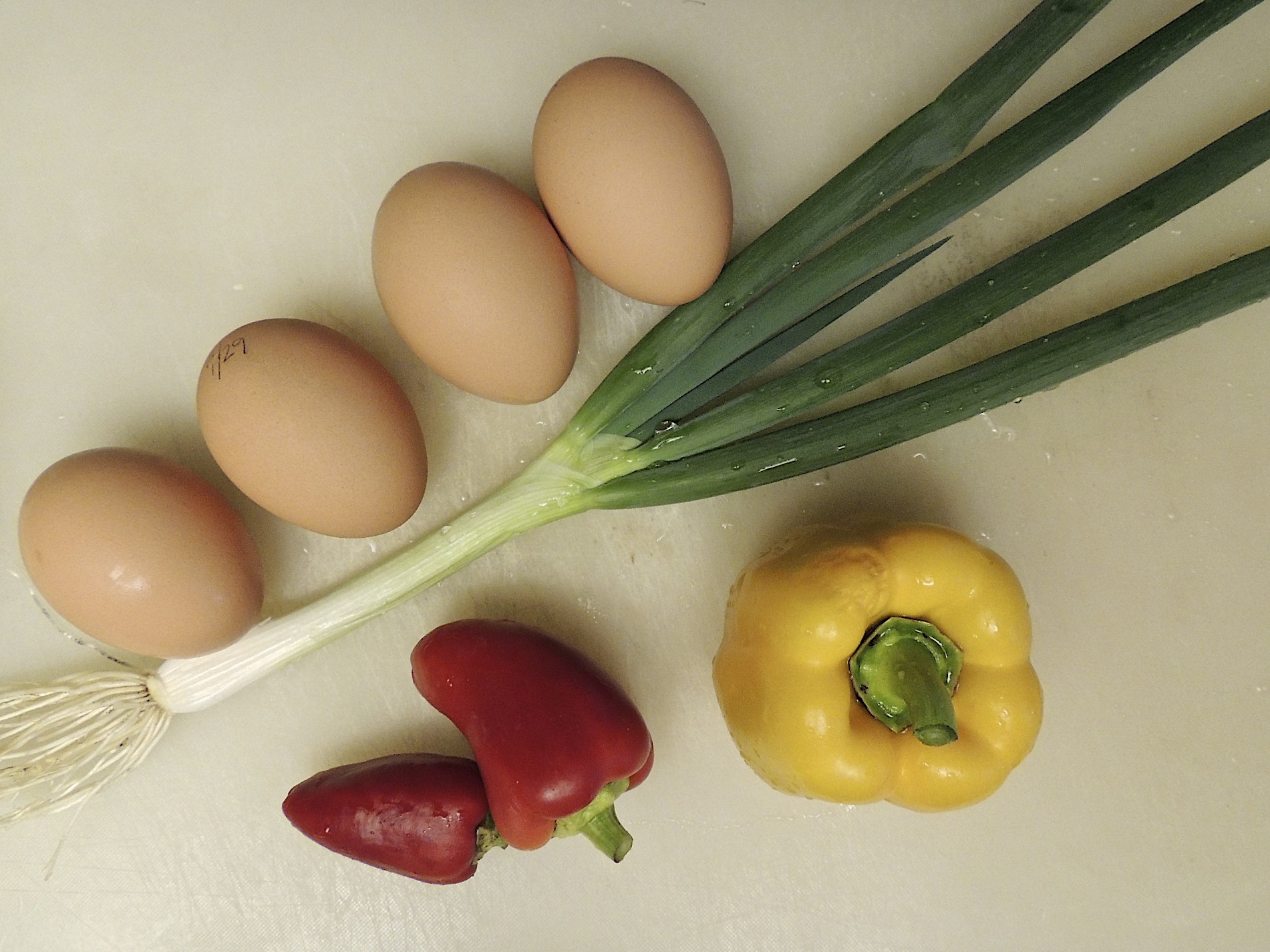Eggs, green onion, and bell peppers. The conical ones are Giant Szegedi, only they’re not so giant. Looks like breakfast.