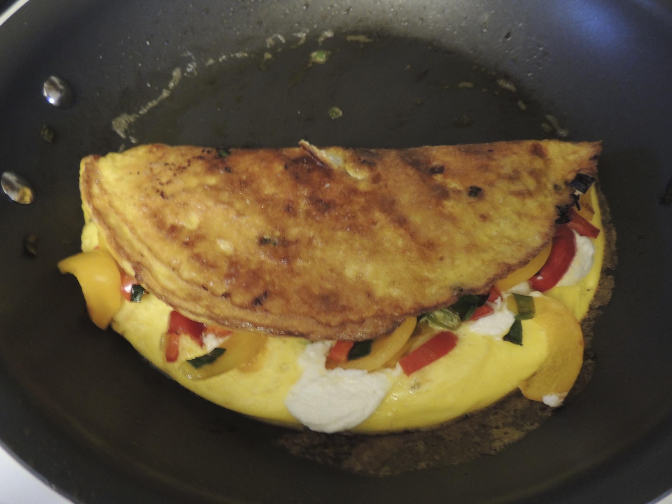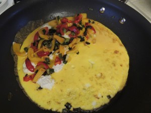 Cook the egg mixture in a covered skillet until almost set. Add a few chunks of cream cheese and the sauteed vegetables. Fold the omelette in half and cook covered until completely set.
