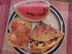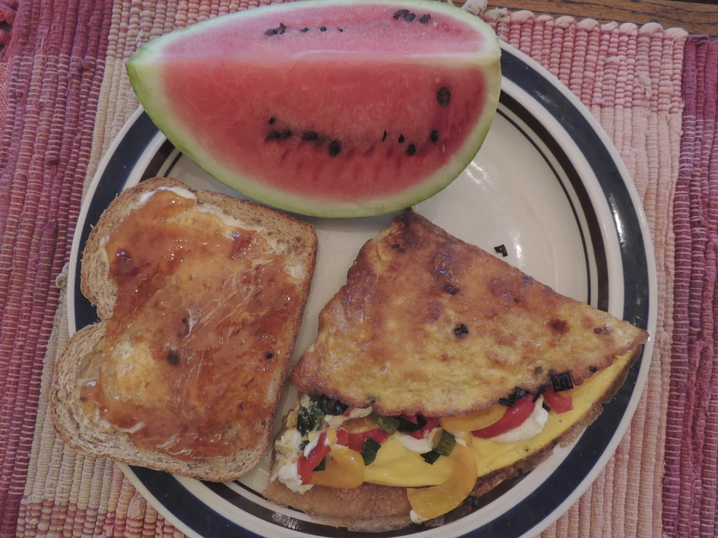 Serve with the bread product and fruit of your choice. I used watermelon because that’s what we had from our garden this week. That’s homemade jam on the bread.