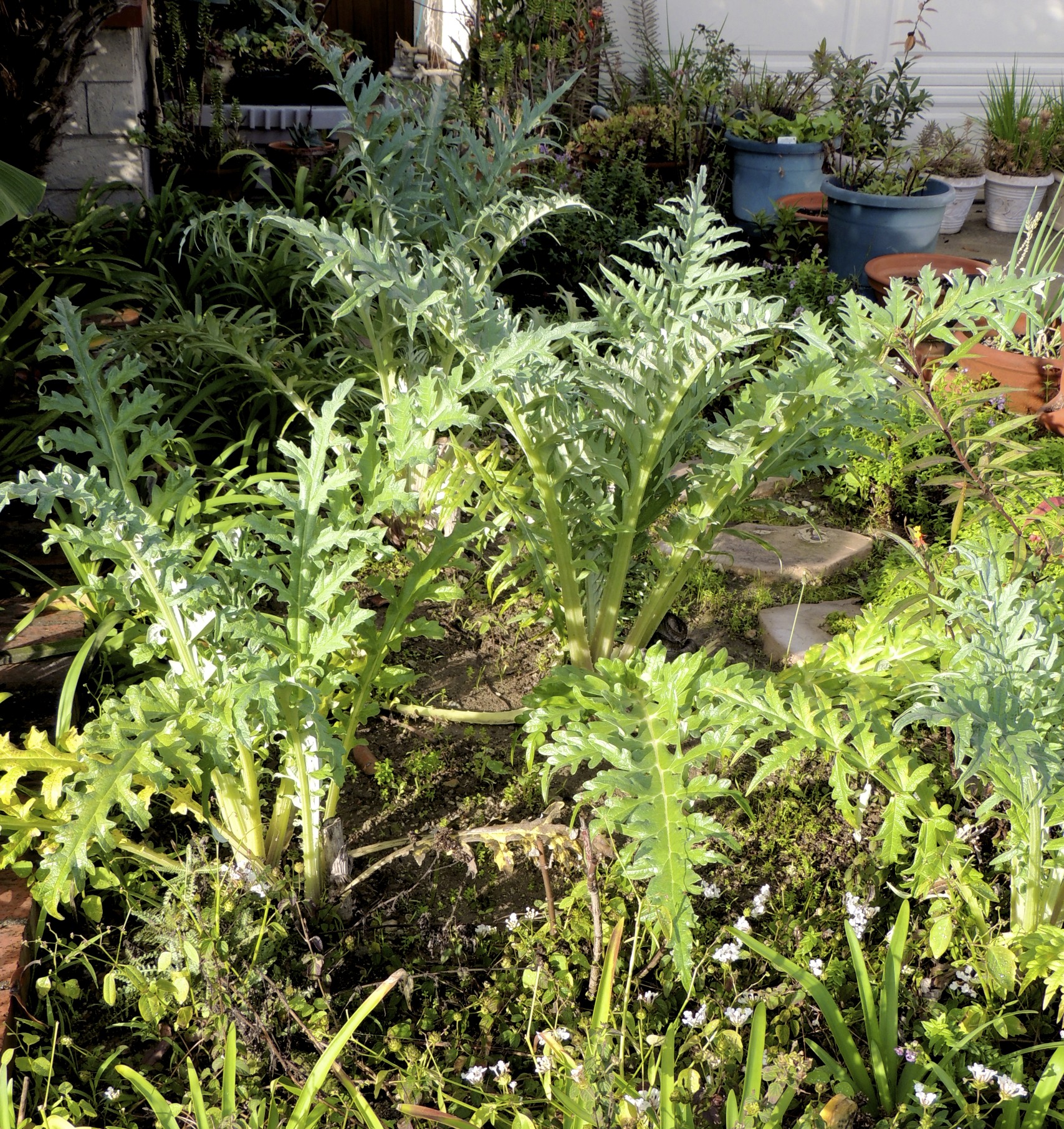 We have five artichokes this year. They are short-lived perennials, and these are probably on their third year. They die back, and resprout from the root.