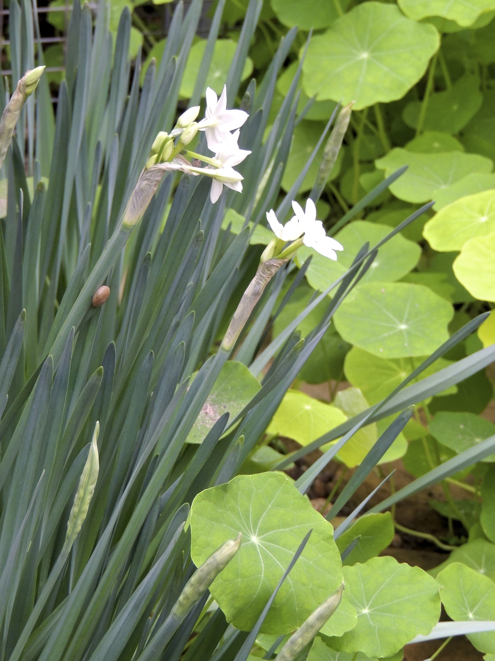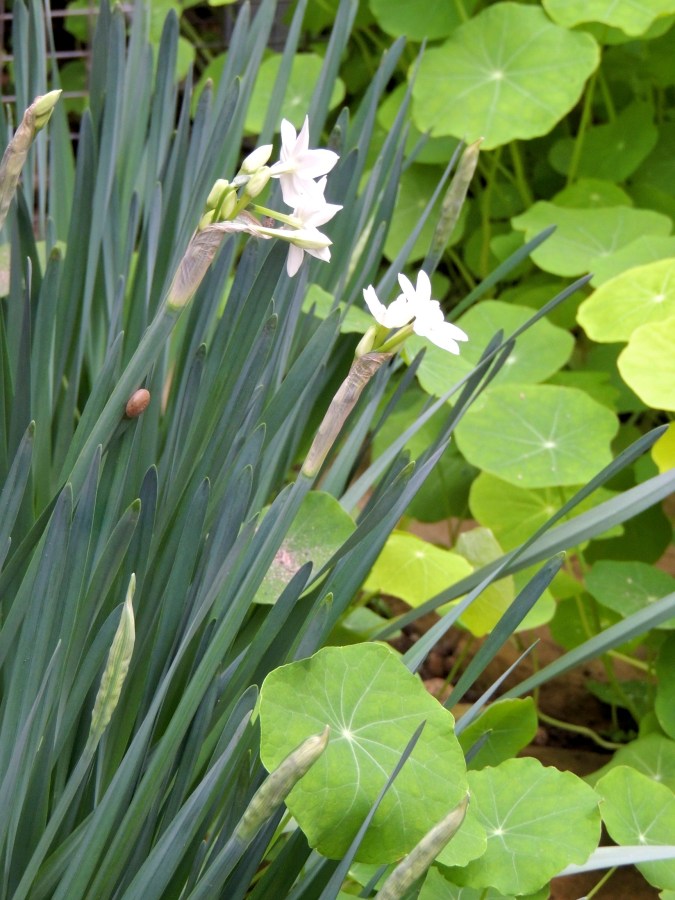 The double paperwhite narcissus are the first to bloom. And nasturtiums are everywhere in back. Too soon for blooms for them.