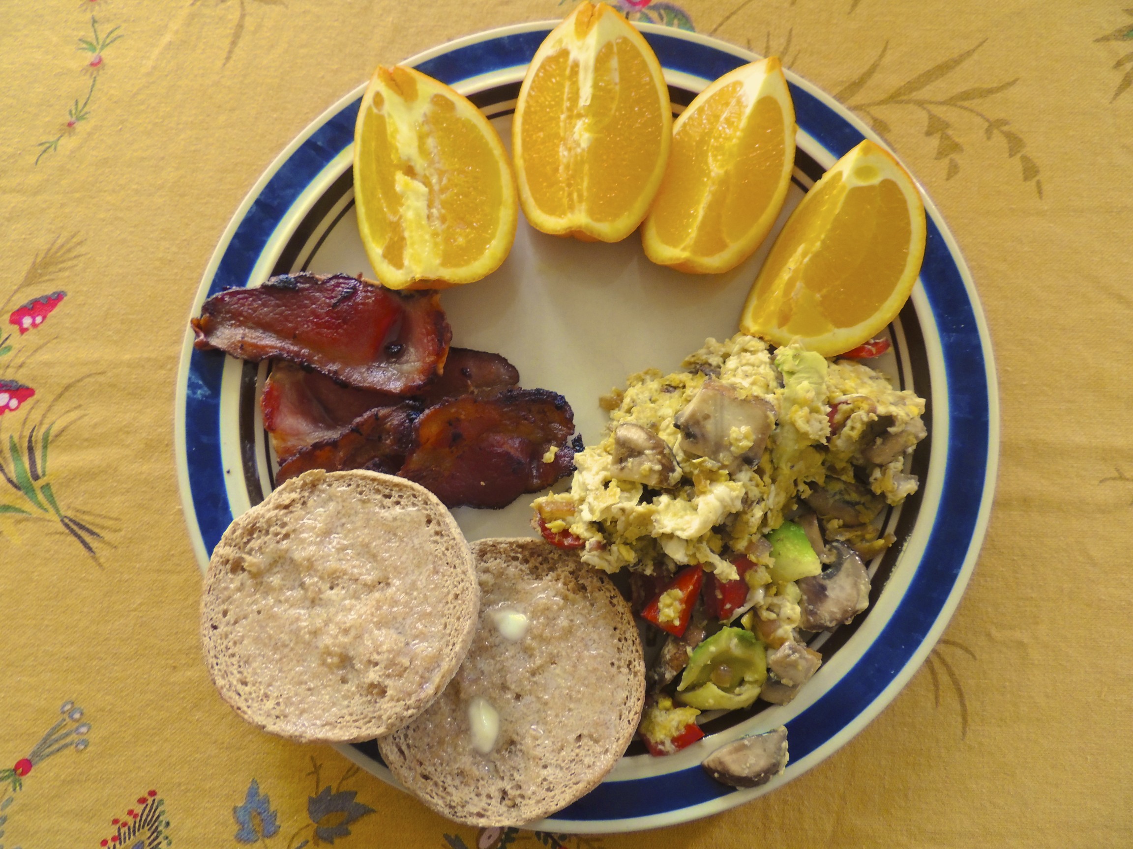 The bell pepper went into a scramble along with red onion, mushrooms, and an avocado (also from the garden). The navel orange is from our tree.