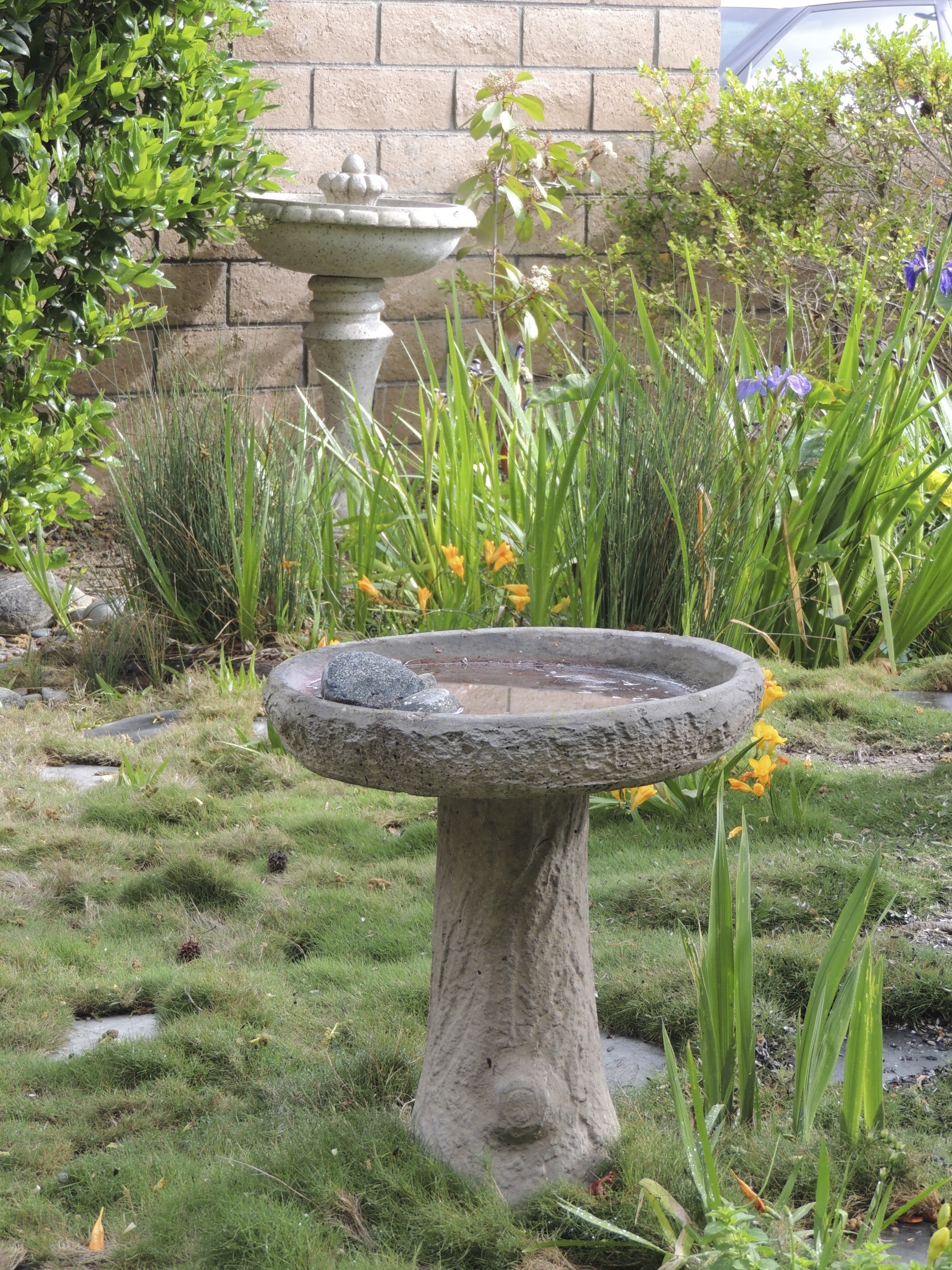 In addition to the pond, we have a bird bath. The one in back is a used fountain dropped off by our tree guy. One of his customers was throwing it out because it no longer holds water. He thought I might be able to fix it. My first attempt failed. I will try Plan B some other day.