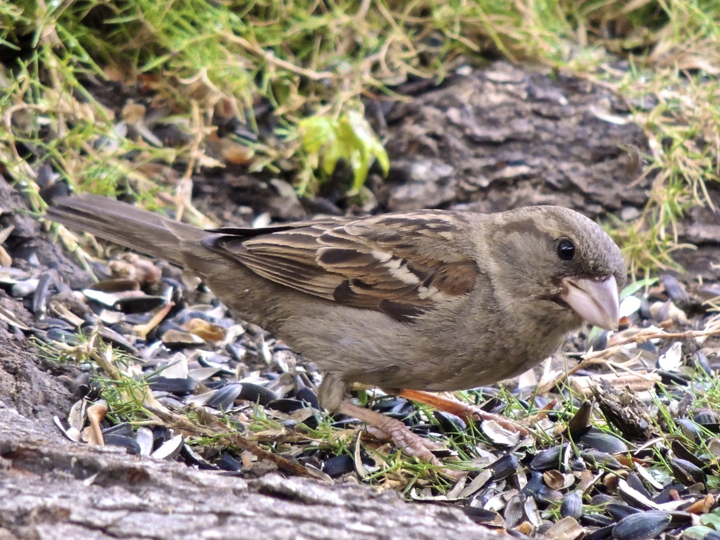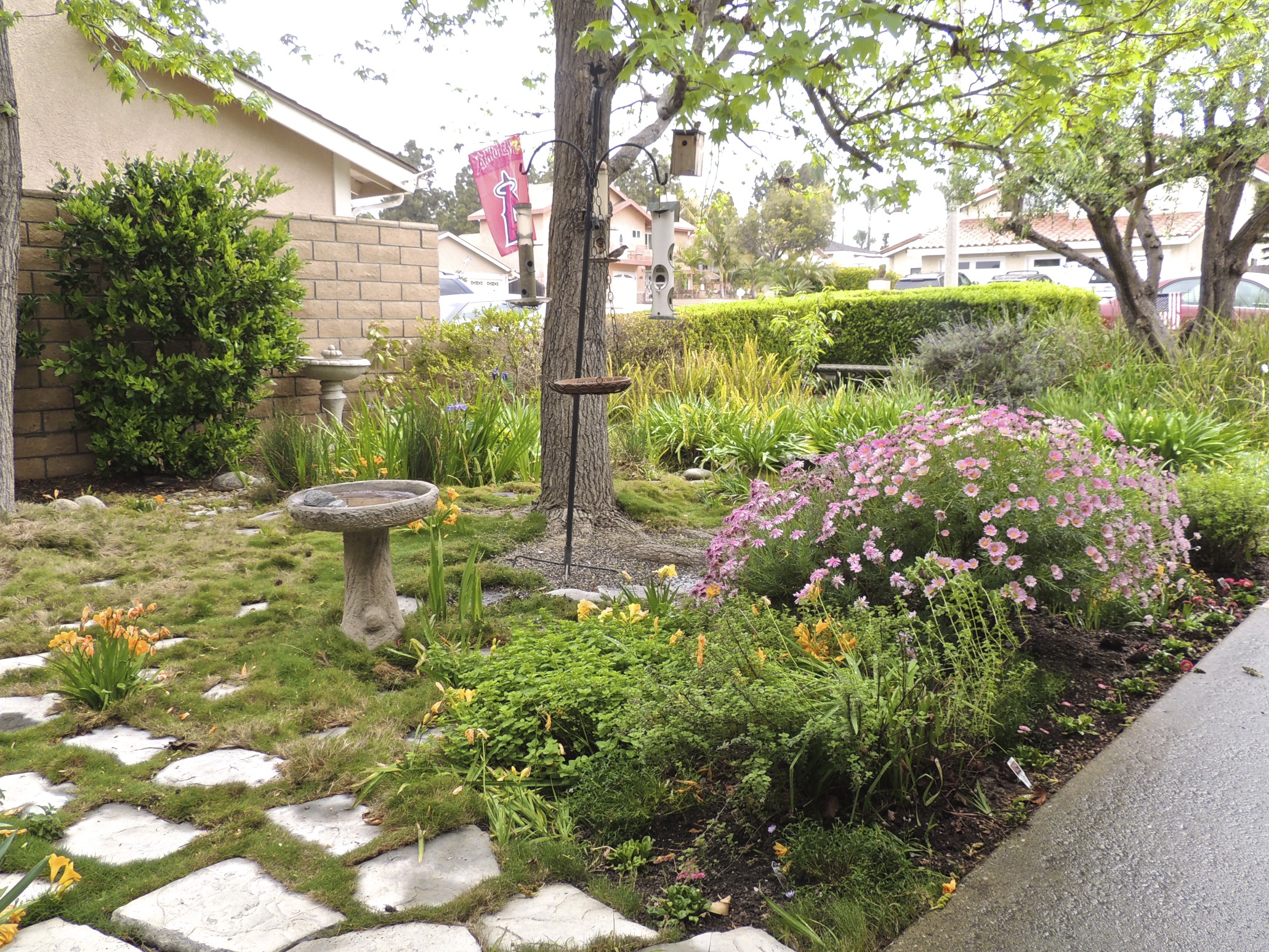 Our front yard is mostly trees, shrubs, flowers, herbs,  bird feeders, and a small pond.