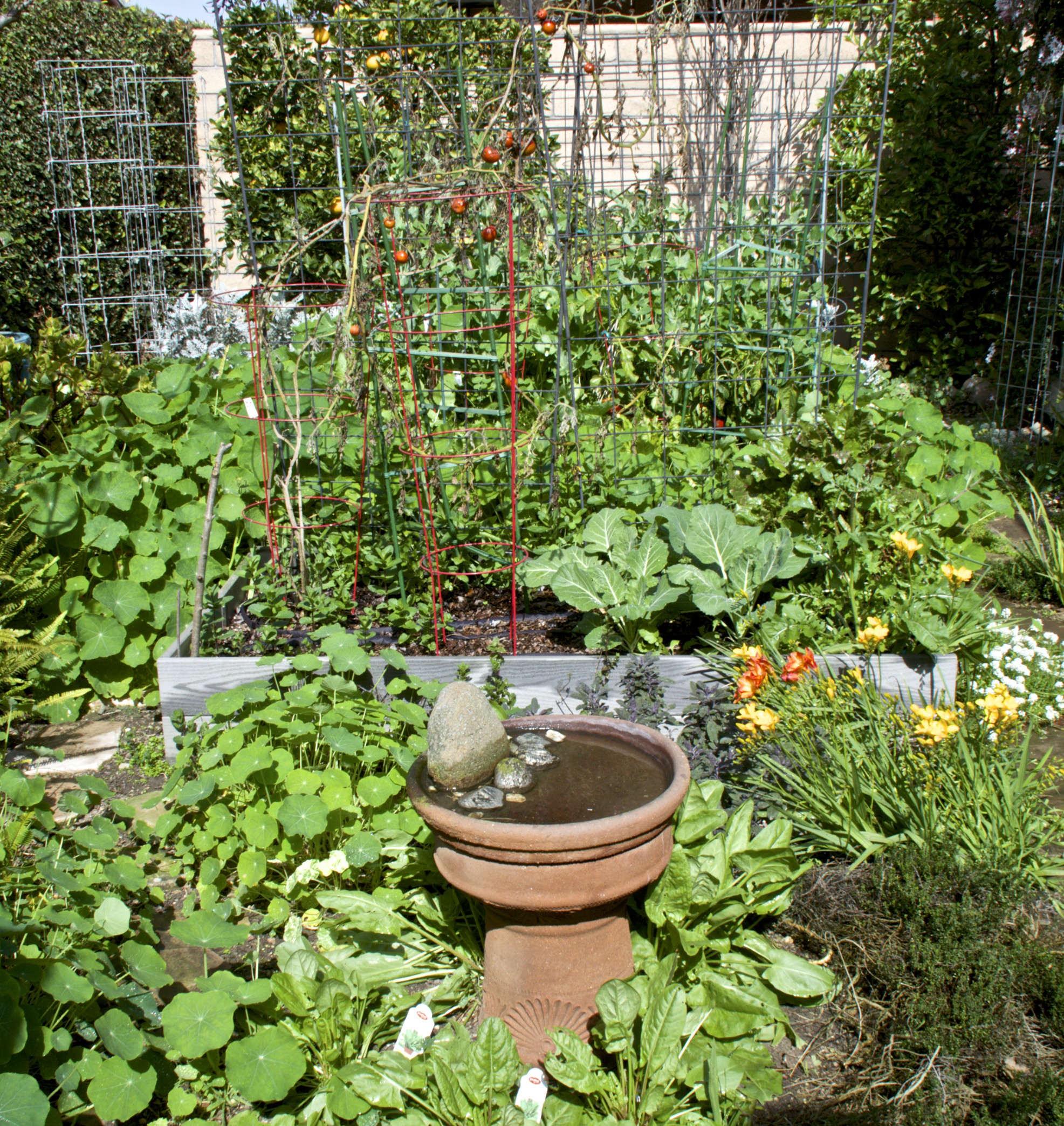 Keep in mind that although California is suffering from a major drought, and that the average household water consumption per person is 150 gallons/day, we use only 50-60 gallons/day per person. I (1) use soaker hoses for my vegetable garden, (2) use rain water collected in rain barrels, (3) group plantings by water requirements, (4) have low-flow toilets, and (5) don’t let the water run indoors or out. We have all of these fruits, vegetables and flowers, yet we use one third of the amount of water that the average person uses in California.