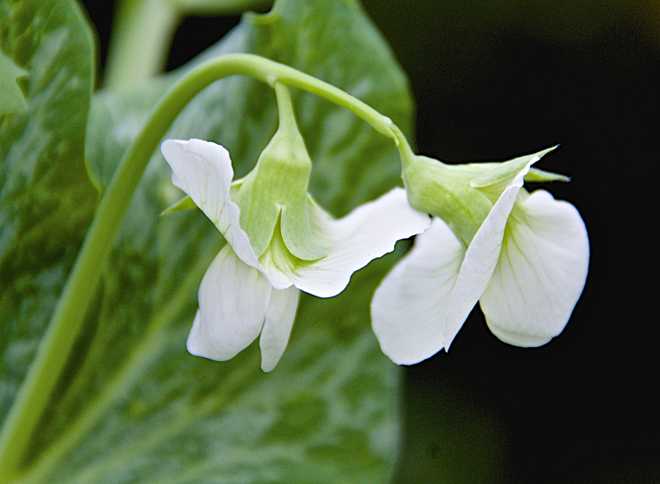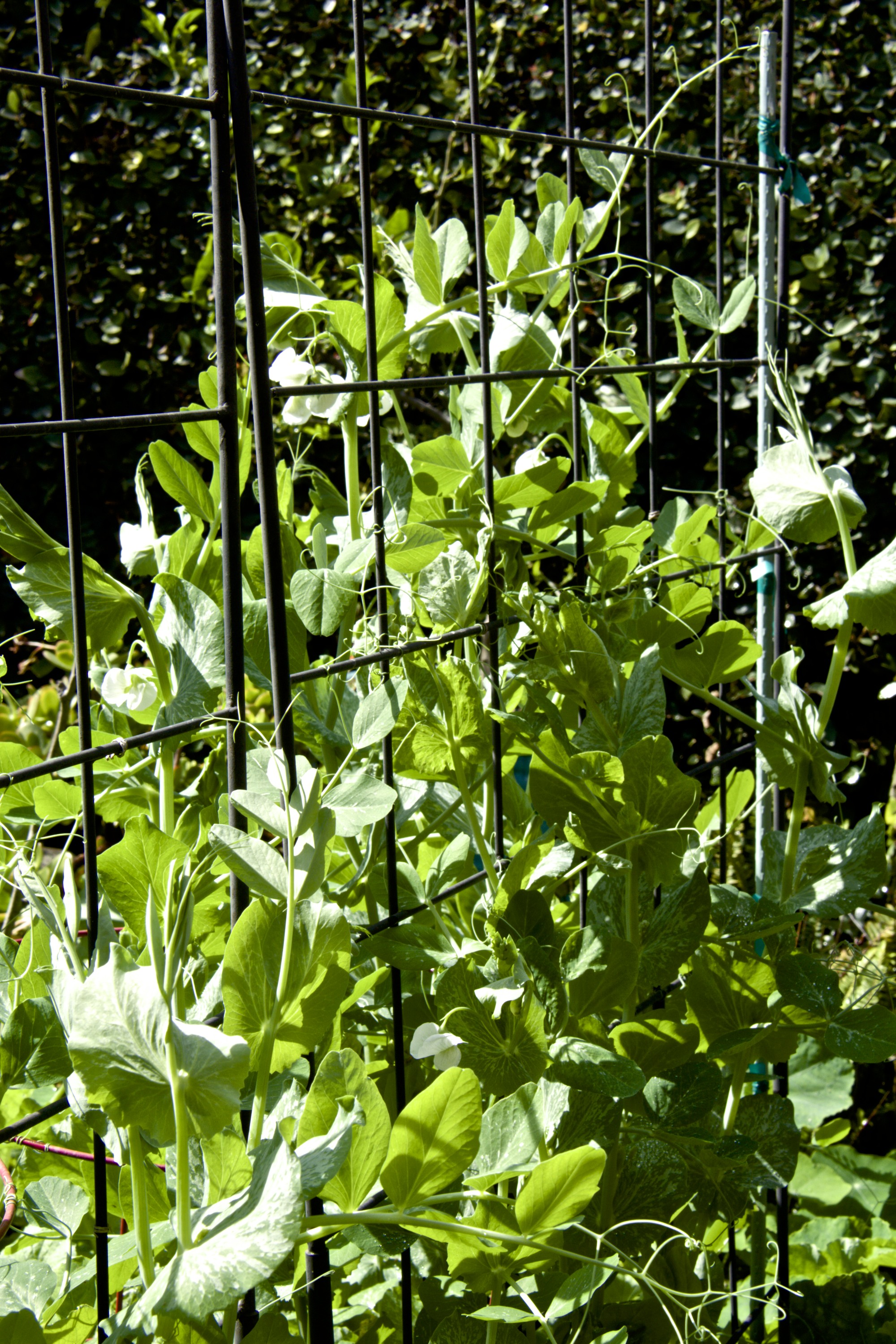 Don’t you just love pea flowers? I can hardly wait for our first snow peas. The birds ate my entire first planting, gobbled up the little seedlings as soon as they sprouted. The peas never had a chance. The birds are now attacking the tips of these huge pea plants. Naughty birds. I may need a net cover,