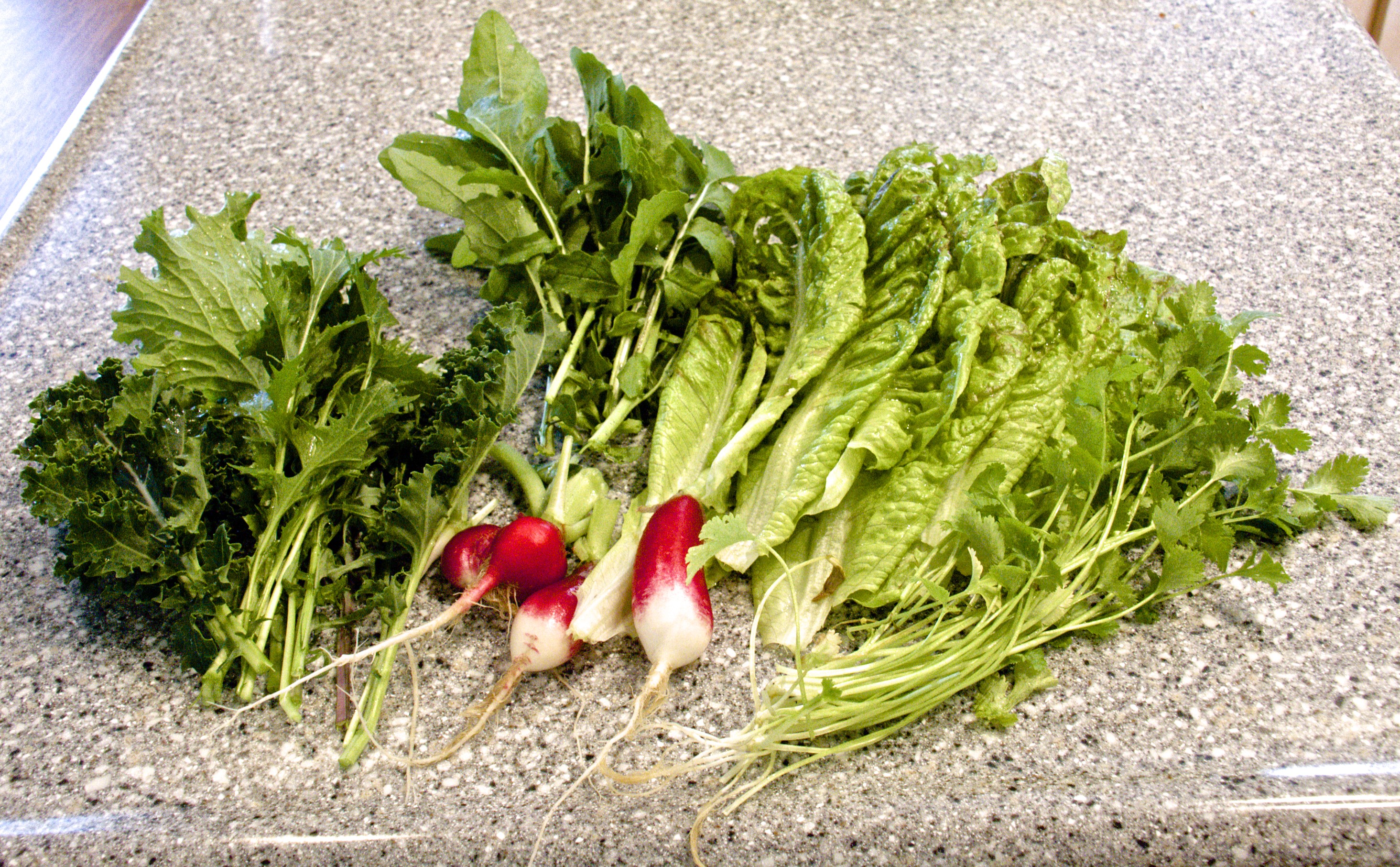 Salad making from my garden with the first harvest of radishes for the spring. There is also baby kale, Freckles lettuce, cilantro, and arugula.