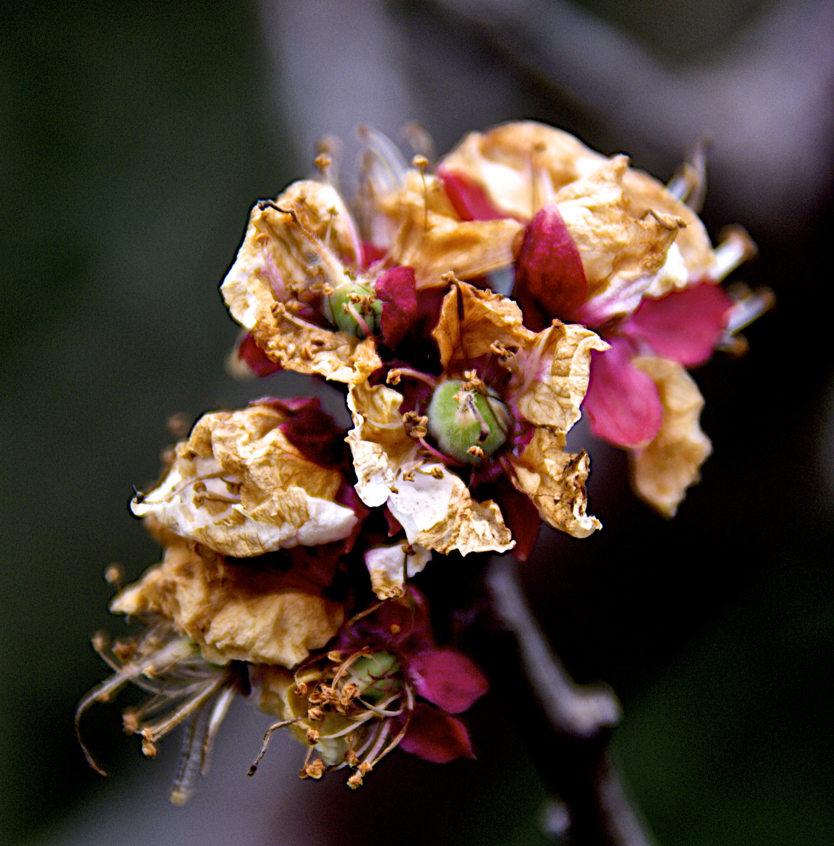 The flowers are fading on our apricot tree, but little tiny green fruits are forming below the dying petals.