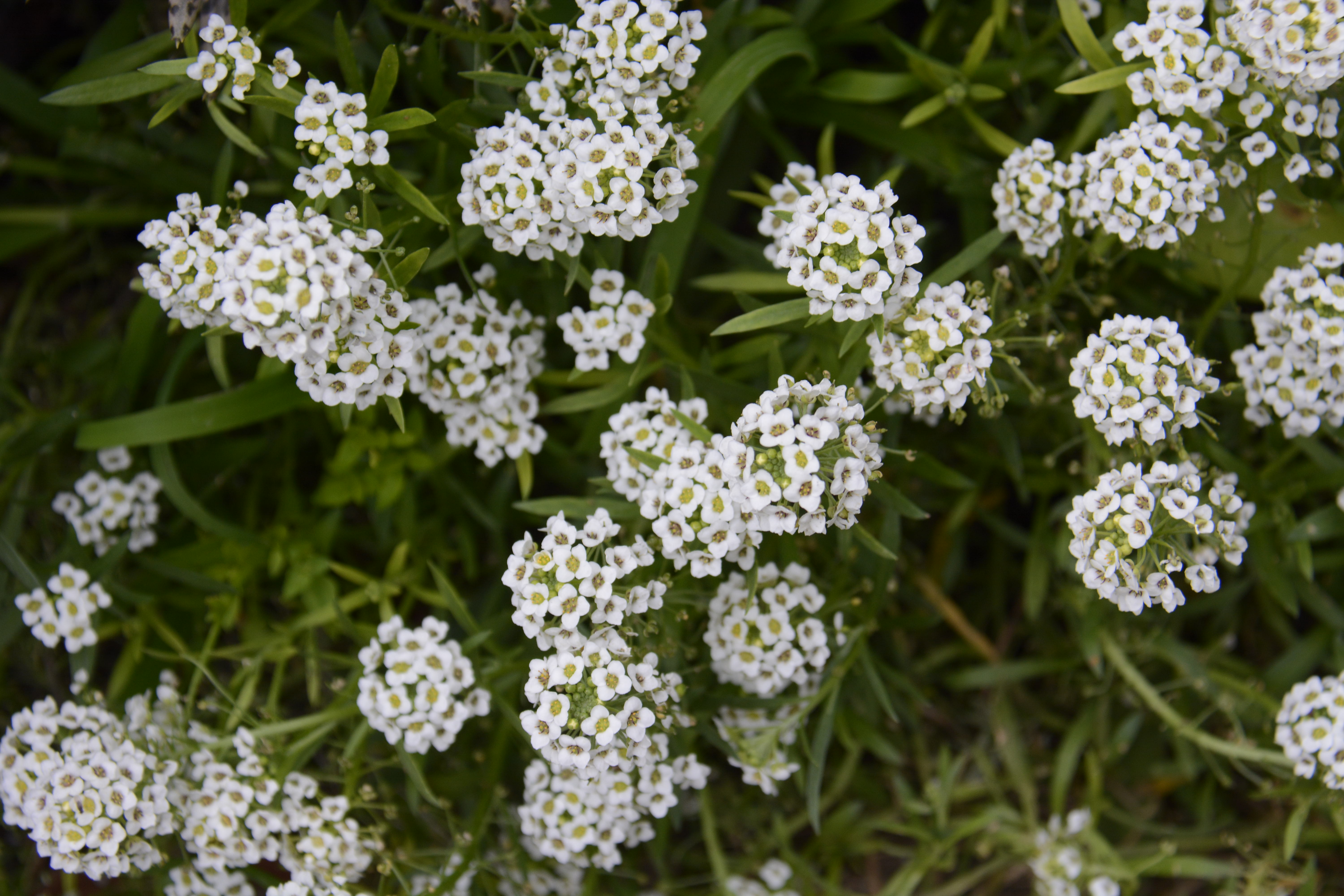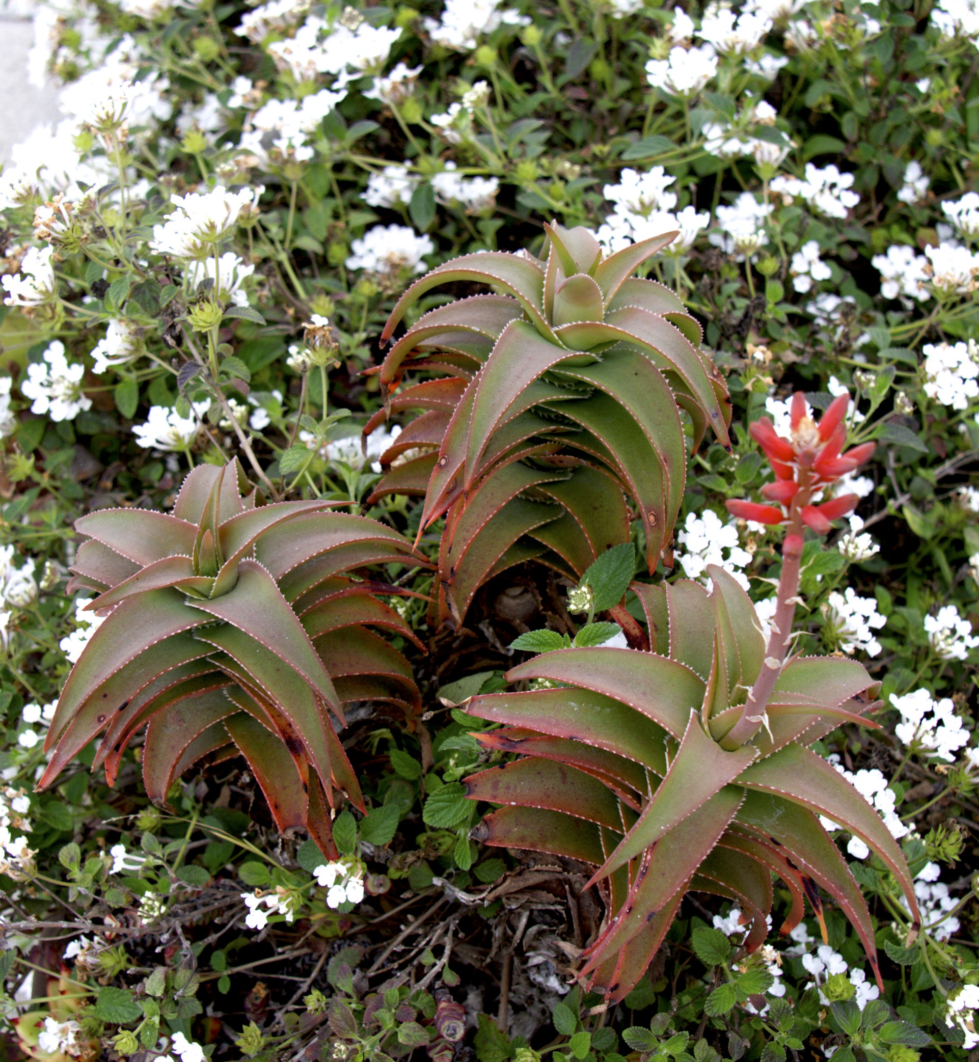 The background is white lantana, part of my butterfly garden. This succulent is blooming. No idea what it is.