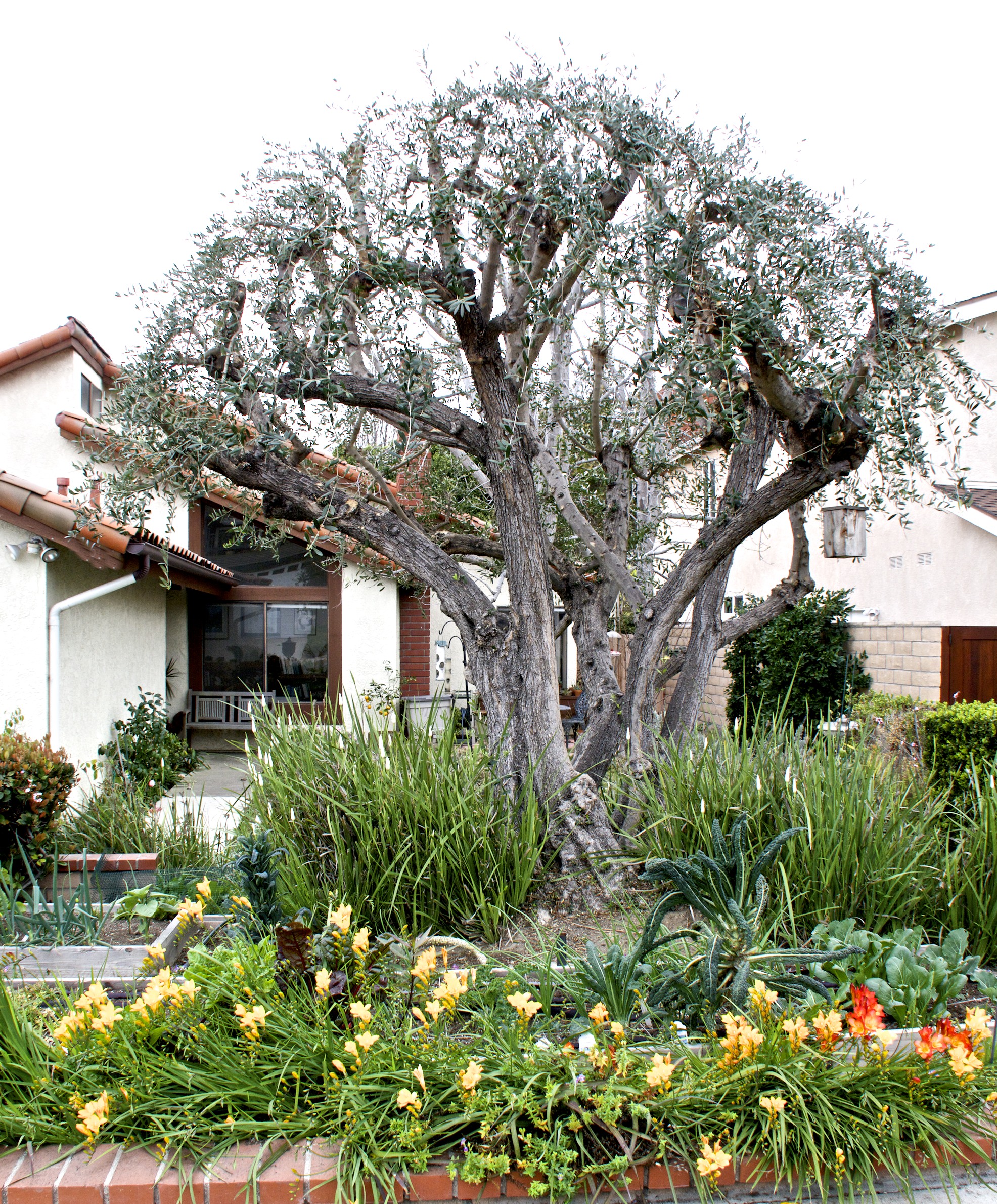 We just had the olive tree pruned to give my garden more sunlight. Check out that nice row of blooming yellow freesias in front.
