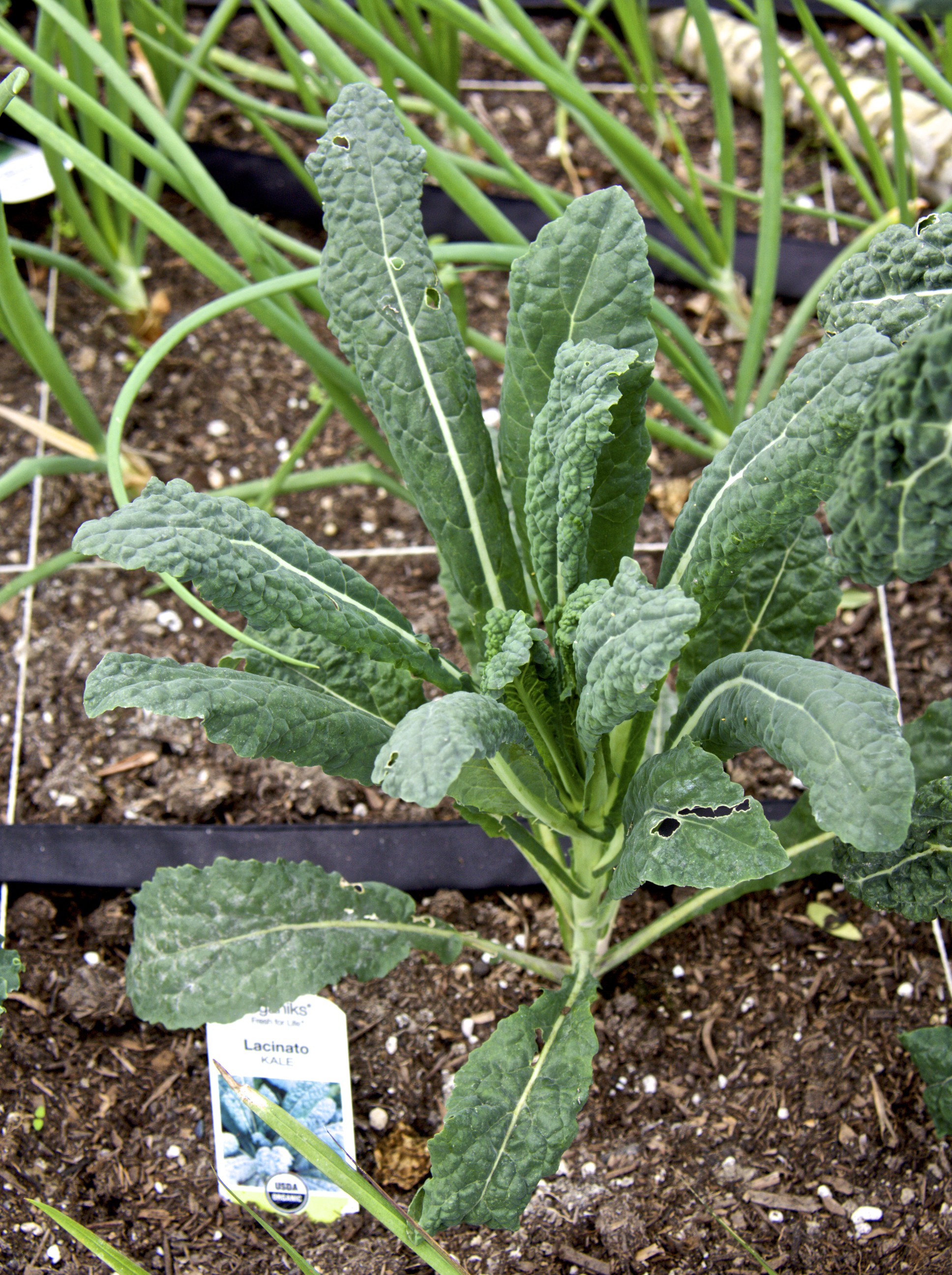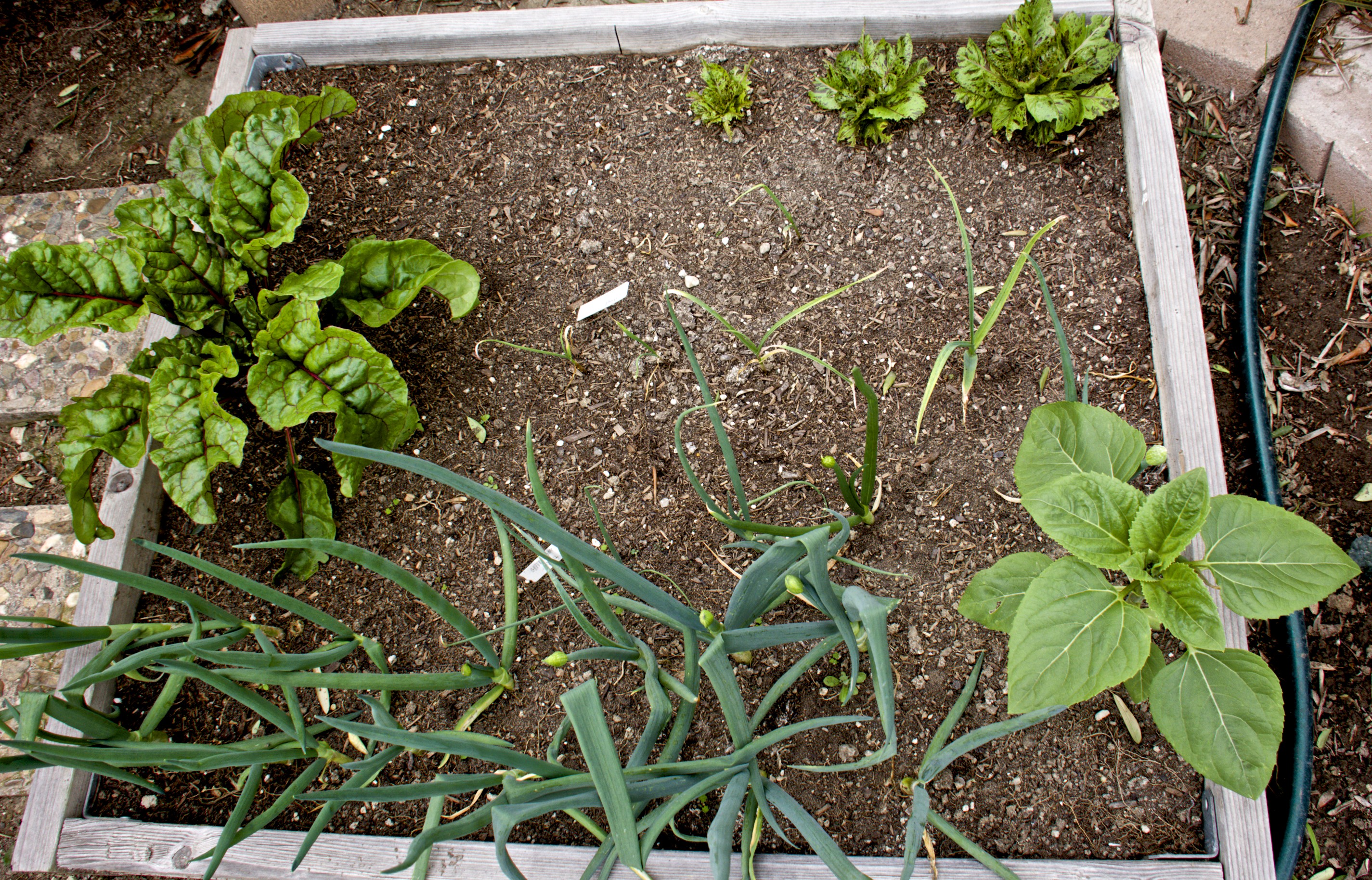 This little bed in front has green onions, some garlic, a volunteer sunflower, a chard, and some Freckles lettuce that has been decimated by birds.