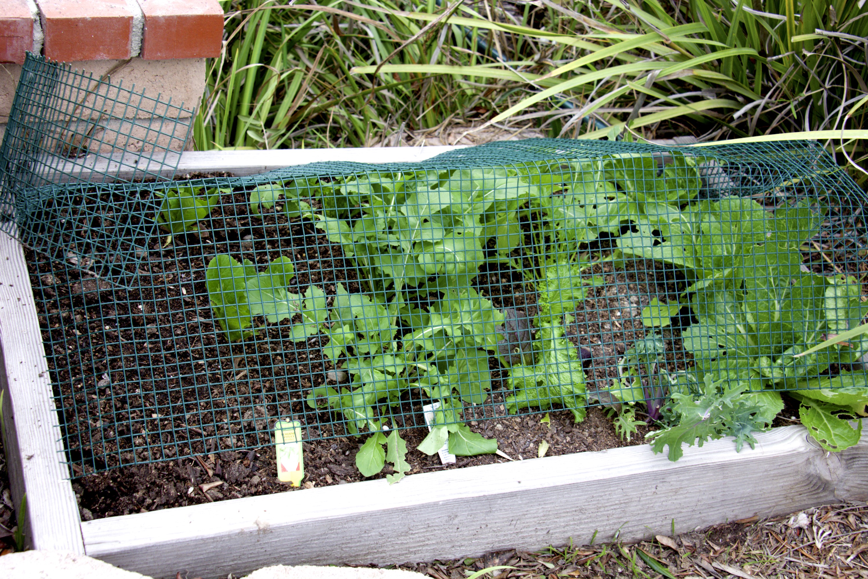 I made a cage of hardware cloth to fit over this bed of mesclun, lettuce and Napa cabbage, but I built it too late to save the lettuce.