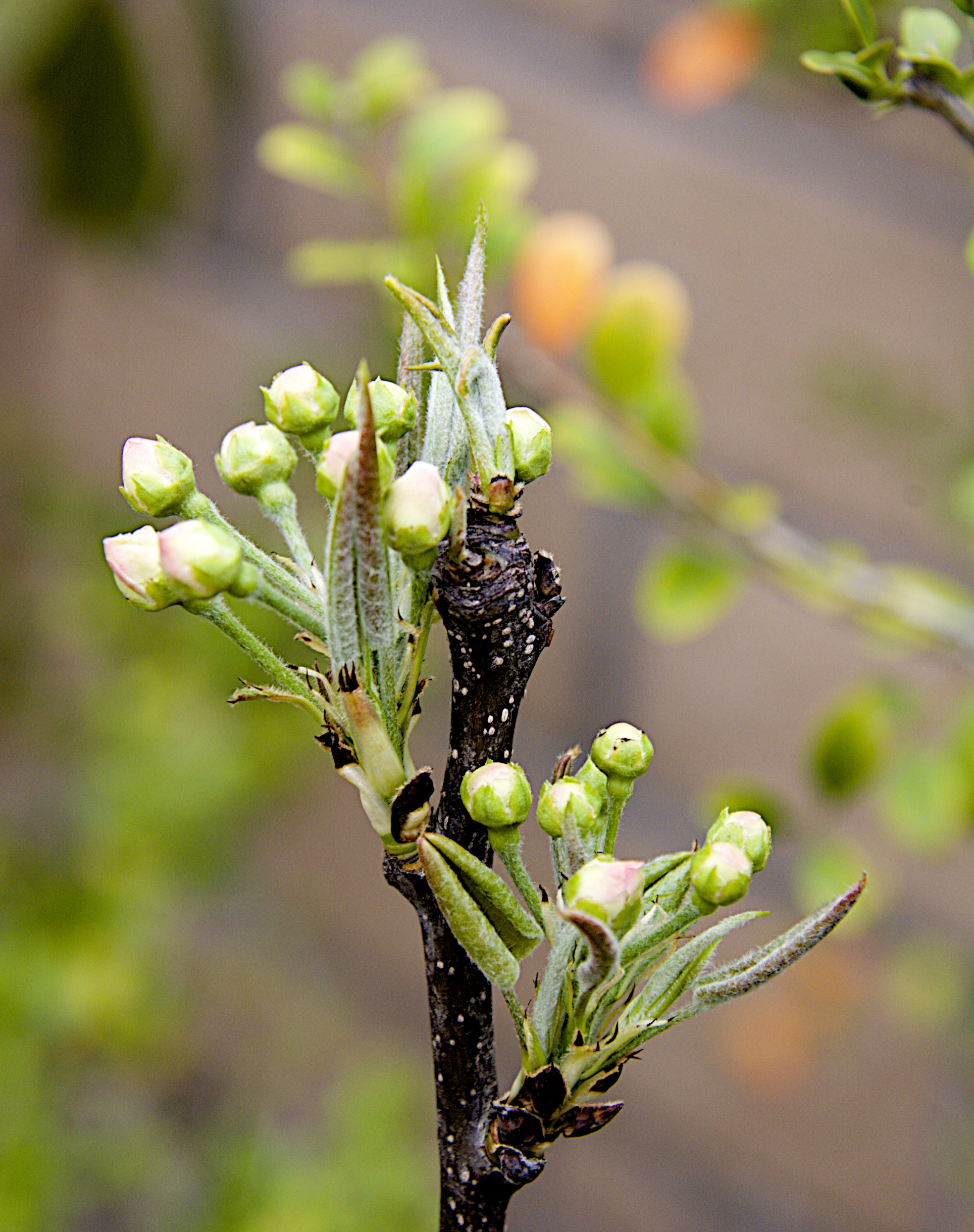 These flower buds are the ones that I am the most excited about. They are on my new grafted Asian Pear that has four different varieties on it. This is a newly planted tree, so I’m happy to see it leaf out and bloom. This winter was most likely too warm and mild for my older Asian pears to set fruit as they need a certain number of hours of chilling. This new tree spent most of the winter in a nursery somewhere colder than our yard.