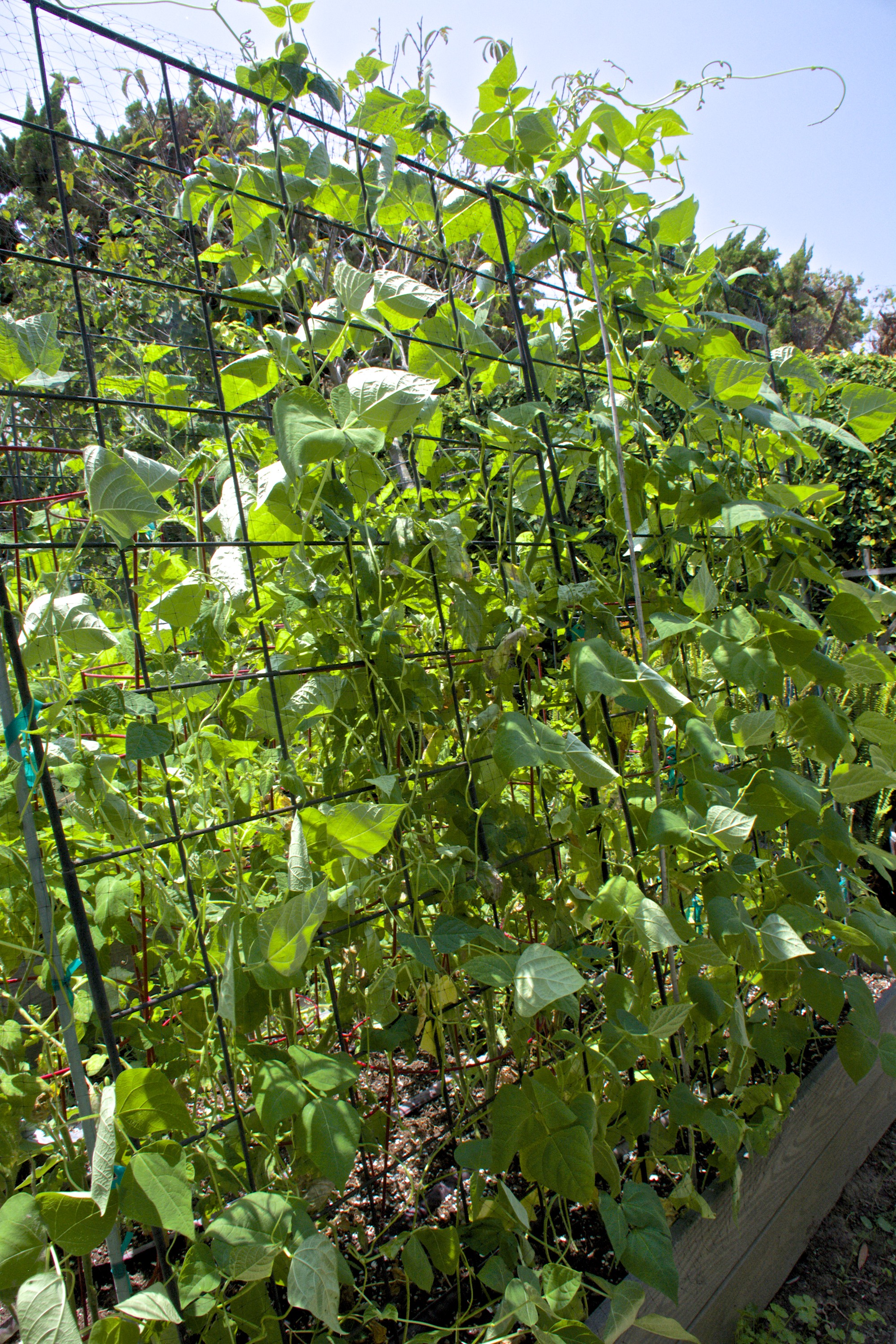 This handsome row of green beans is towering over my head, but there is not one single flower on the bean vines. Yet.