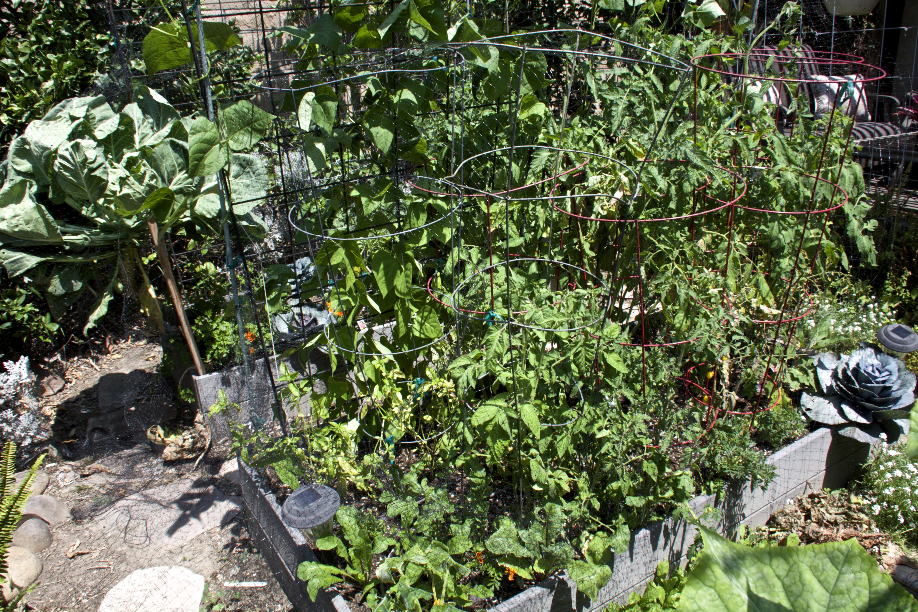 An overview of my three veggie beds in the back yard. They sure are looking lush. Too bad that there is nothing to harvest from them. Yet.