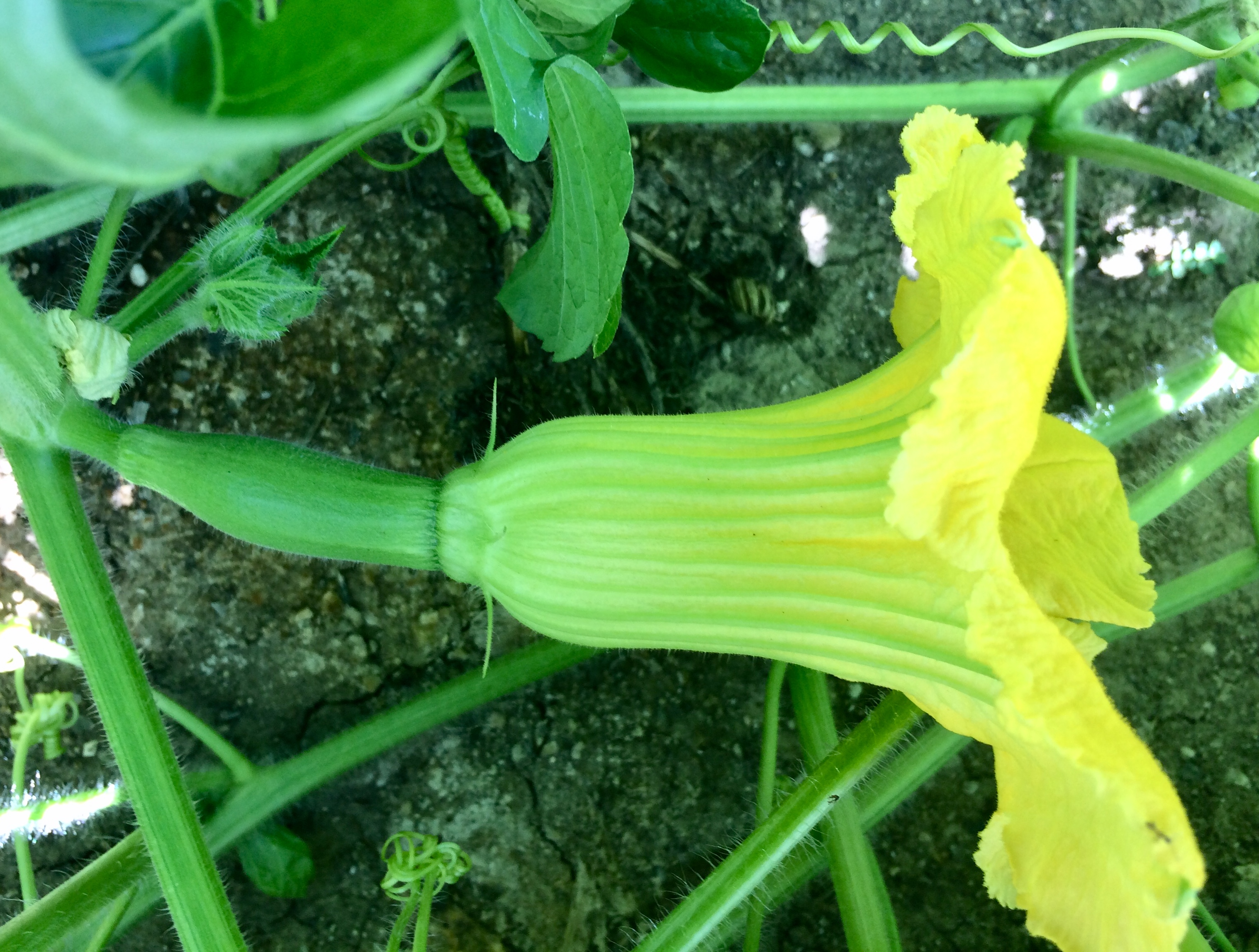 I am most excited about the two varieties of winter squash in this bed because, well, I am just plain silly about squash. I am growing Mayo Blushers and Guatemalan Blues in this bed. I have grown the Mayo Blushers before. The seeds are from Native Seed Search, a non-profit that collects native-grown seeds from throughout the American Southwest and Mexico. Mayo Blushers make small to medium-sized winter squash that turn a pinkish color when they are ripe. The first TINY female flower bud showed up on those plants today.