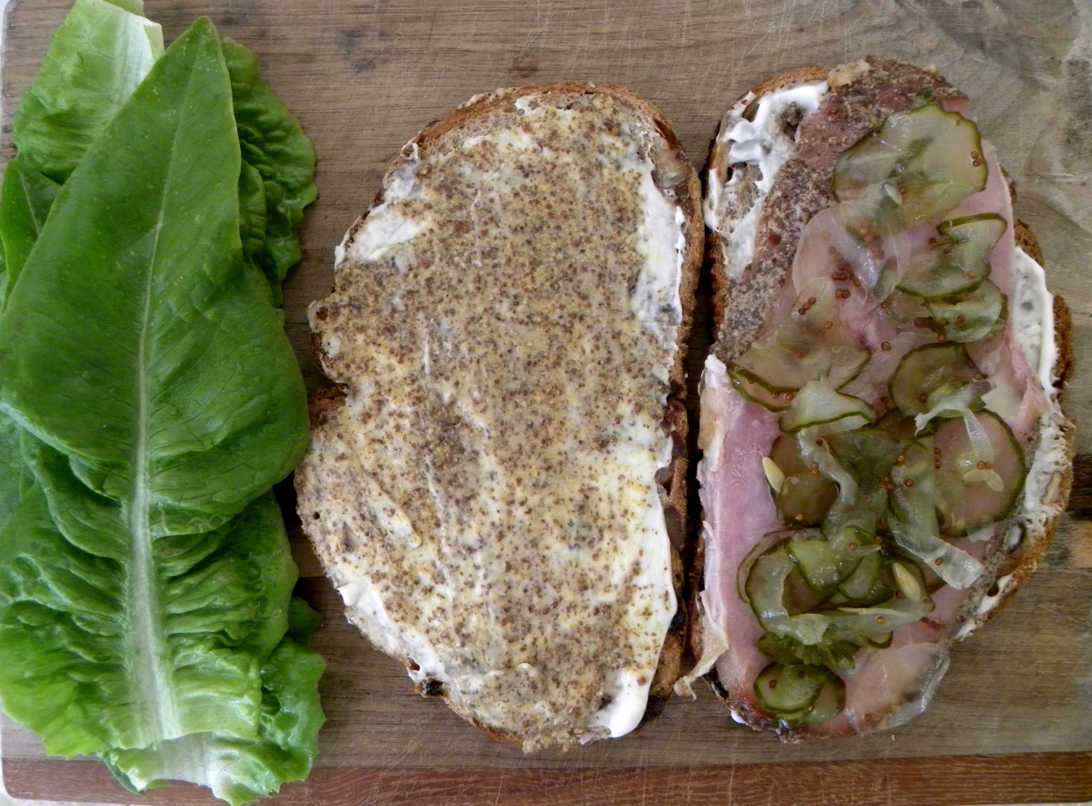This is a ham sandwich on Russian Raisin Pecan bread from Schat’s Bakkery in Bishop, CA. The mustard is homemade (thanks, Robin, for the recipe), as are the bread and butter pickles from last summer’s cucumbers. Still have two jars left. The lettuce is freshly picked Deer Tongue lettuce from my garden. Deer Tongue, Black-seeded Simpson and Lollo Rosa are my three favorite letttuces. Oh, better add Red Oakleaf to that list just for the pretty shape and color.