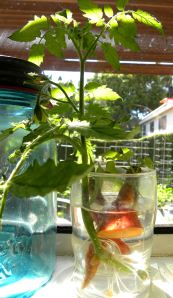 Some of the tomato seedlings that I bought developed damping off, a fungus. I cut the tops off above the infection and rooted the tomato tops in glasses of water on the windowsill. They're now ready to plant. I'm also rooting some yams. Note the blue Mason canning jar. That jar is from my Grandma Wilson, and about 80 years old by now.