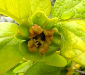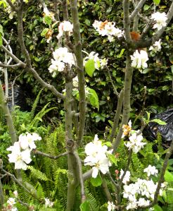 Our Fuyu persimmon tree has a half dozen flowers on it. It didn't produce any fruit last year. It might this year, but I STILL don't have it planted. It's in its original nursery pot. I think it would do a lot better if I actually put it into the ground. It's going into the Garden of Perpetual Responsibility, which is always loaded with weeds.