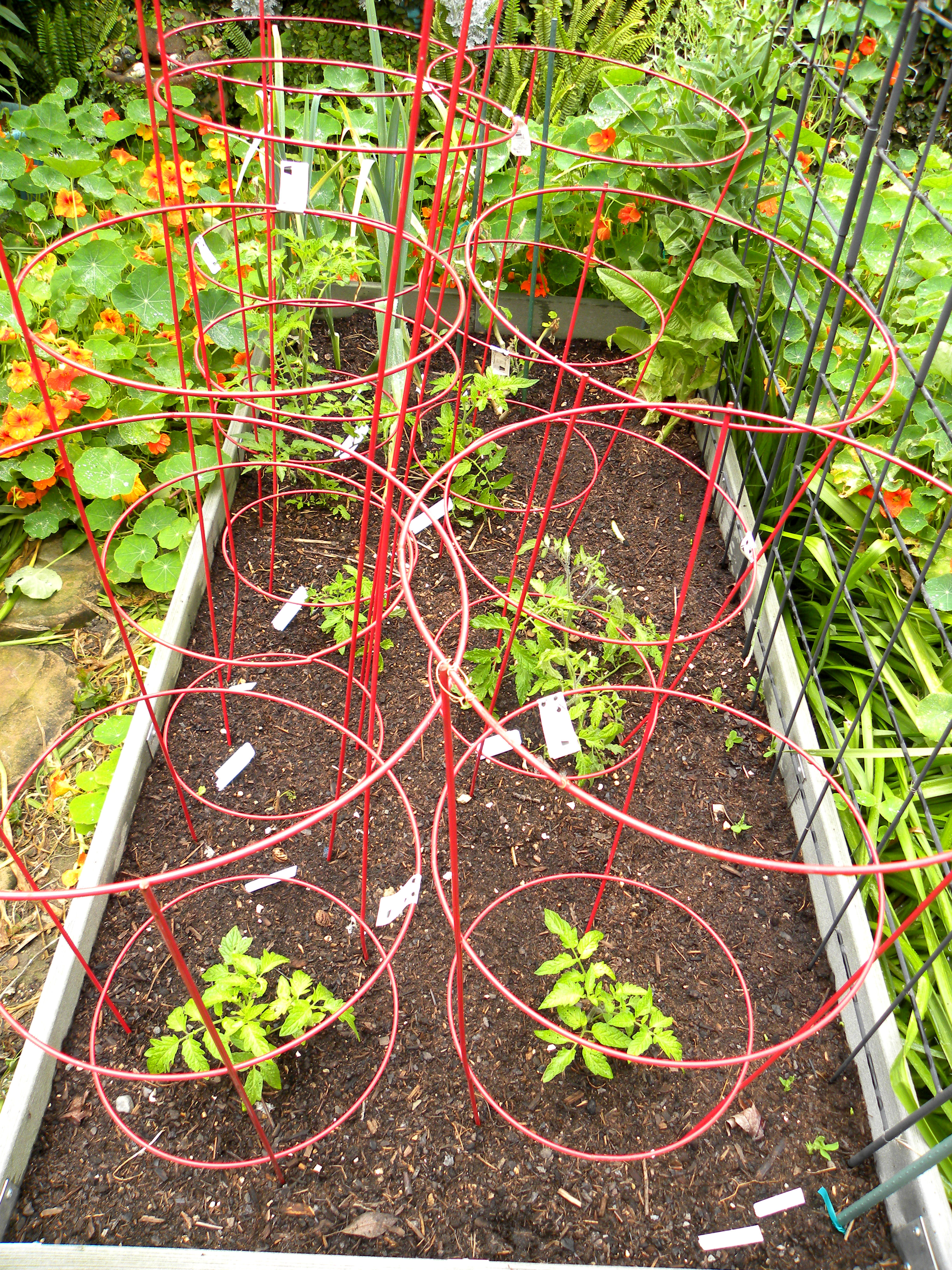 Bed 2 has tomatoes, leeks, Deer Tongue lettuce that is going to seed (it's an heirloom variety and I'll save the seeds), a Black Beauty eggplant that I planted back in 2010 that is still growing, and a row of Super Sugar Snap peas that has just sprouted along the right side of the bed. They'll grow up the metal trellis from Gardener's Supply Company, source of my beautiful raised bed frames.