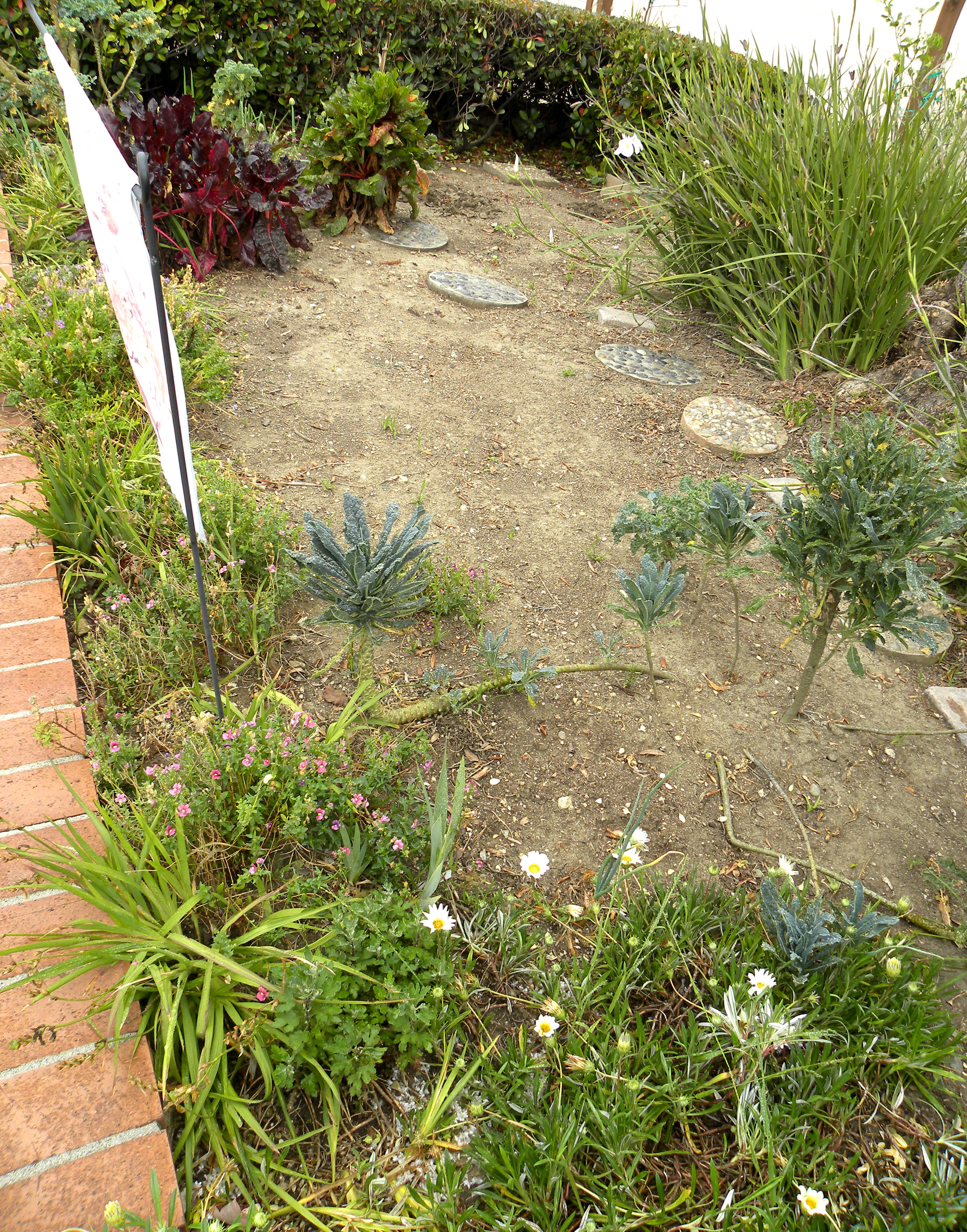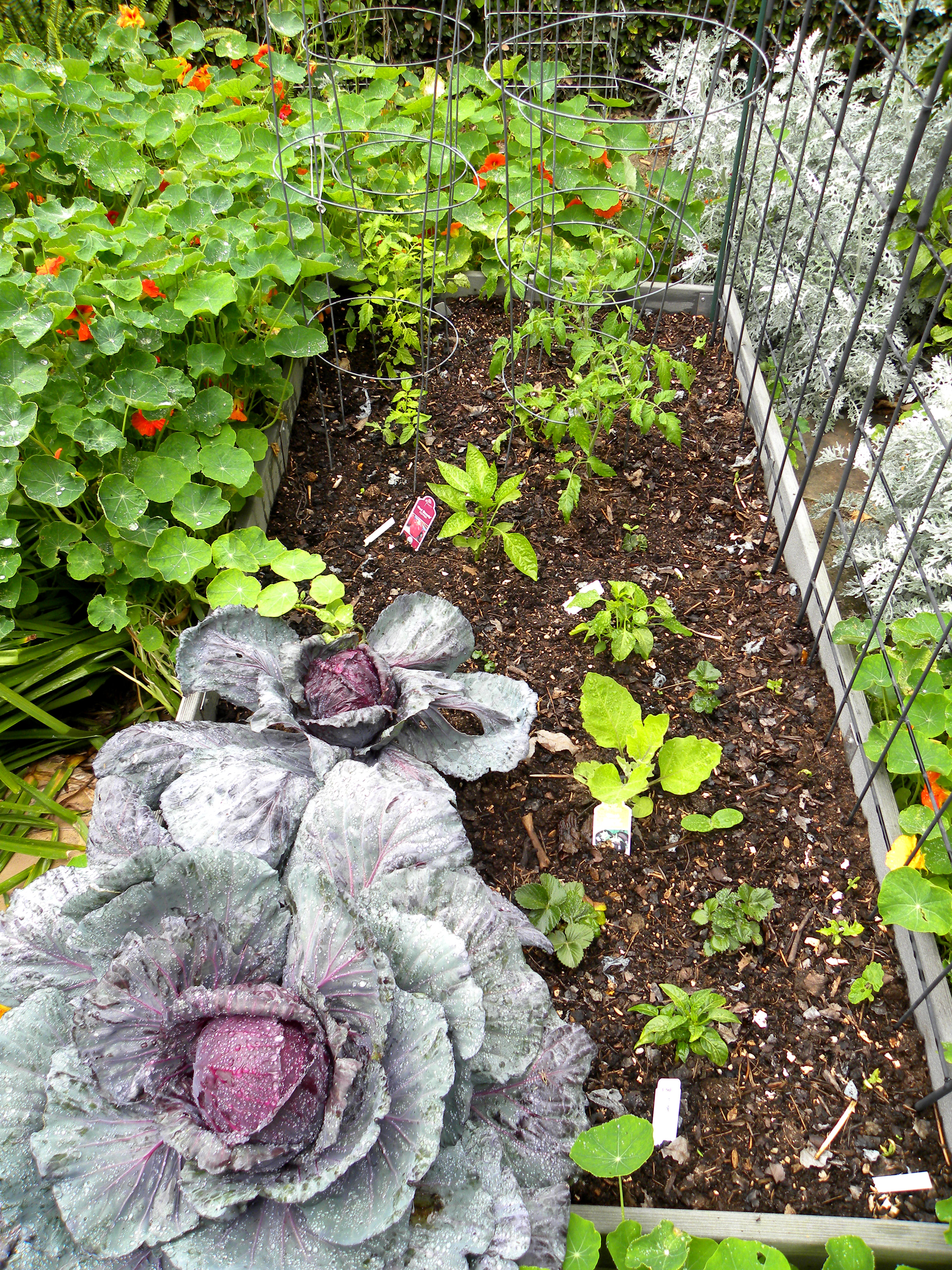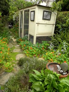 Nasturtiums and narcissus are growing around the perimeter of the beds. I can hardly get through the tangle of foliage to walk around the beds, but I love the look. We have no lawn at all. Saves water.