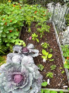 Bed 3 with more tomatoes, a row of Blue Lake pole beans that just sprouted, strawberries, some bell pepper plants, a Black Beauty eggplant, and a couple of red cabbages that seem to be making heads. I haven't had a lot of luck with cabbage, so I'm looking forward to actually being able to eat a homegrown cabbage at long last.