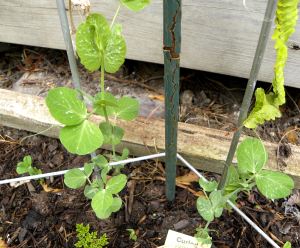 I grow peas and beans up a metal pea fence by the deck. These are Mammoth Snow Peas, the second crop of the year to grow up the fence. When they're done, I'll plant pole beans.